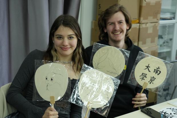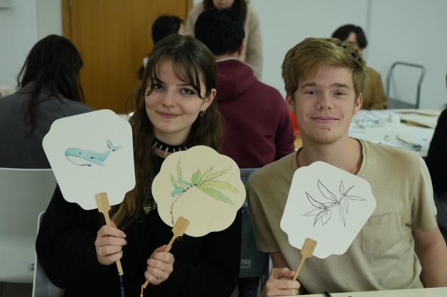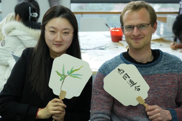 随后的实践体验环节更是让外籍师生们感受到了中华传统书画艺术的魅力。在麻豆TV 同学们的辅导下,他们拿起毛笔,尝试在宣纸和扇面上书写和绘画,他们有人尝试临摹新学的竹叶,有人写下了“麻豆TV ”“我爱中国”的字样,还有人发挥丰富的想象力自行创作,并在作品上题上了自己的中文名。