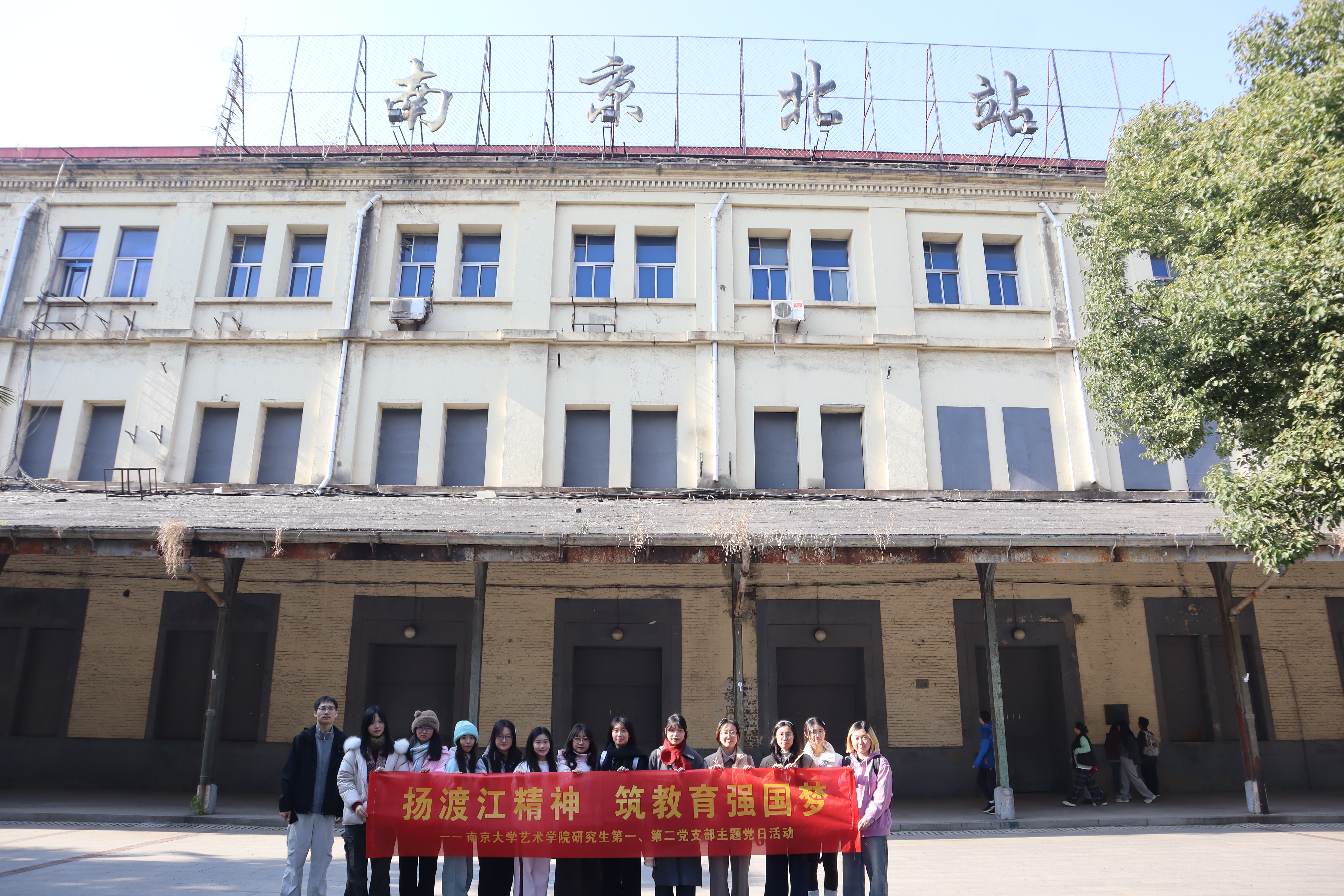活动伊始,全体党员来到浦口火车站历史文化街区。这里是中国近代铁路工业的活态见证,街区完整保留了始建于1914年的英式风格候车大楼、月台、雨廊及部分附属建筑,具有独特的建筑艺术与历史文化风貌。