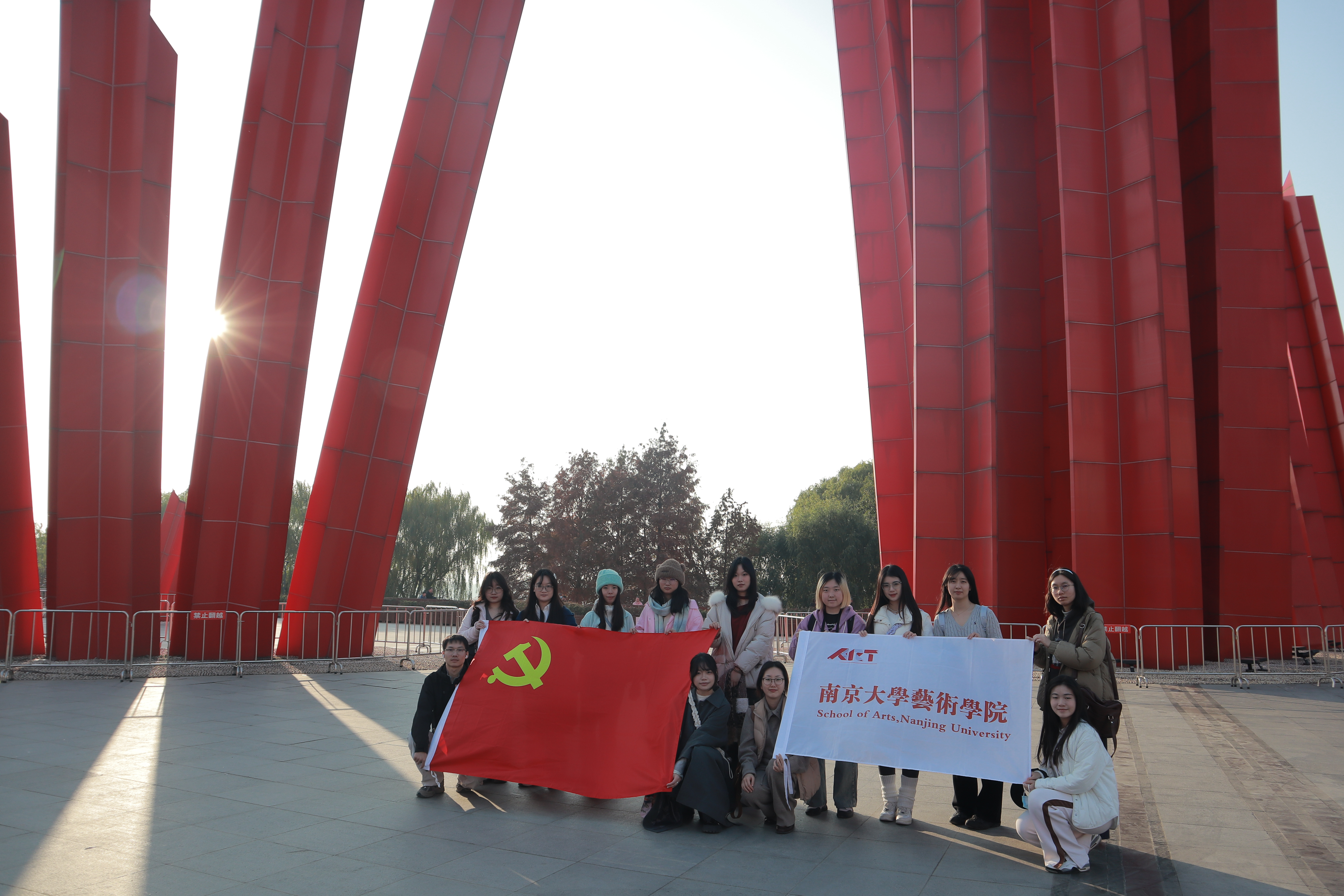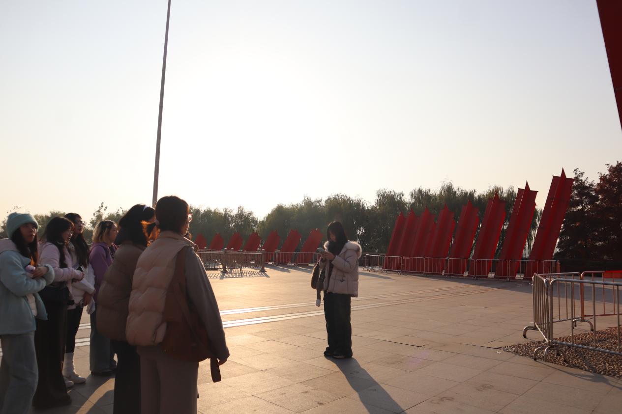 在室外广场,党员们集体参观吴为山教授创作的大型雕塑《千帆竞渡》。49根五角星造型的红色立柱宛如破浪前行的历史风帆,象征着人民军队以木帆船强渡天险的壮举,而49.423米的核心柱体更指向1949年4月23日南京解放的光辉时刻。抽象凝练的现代艺术语言,使革命精神在新时代语境中焕发新的生命力。