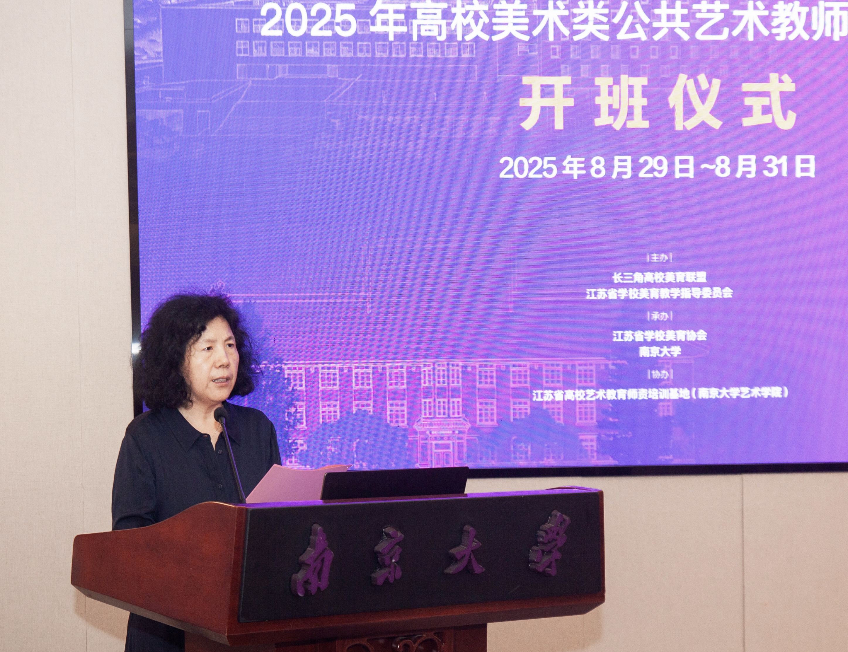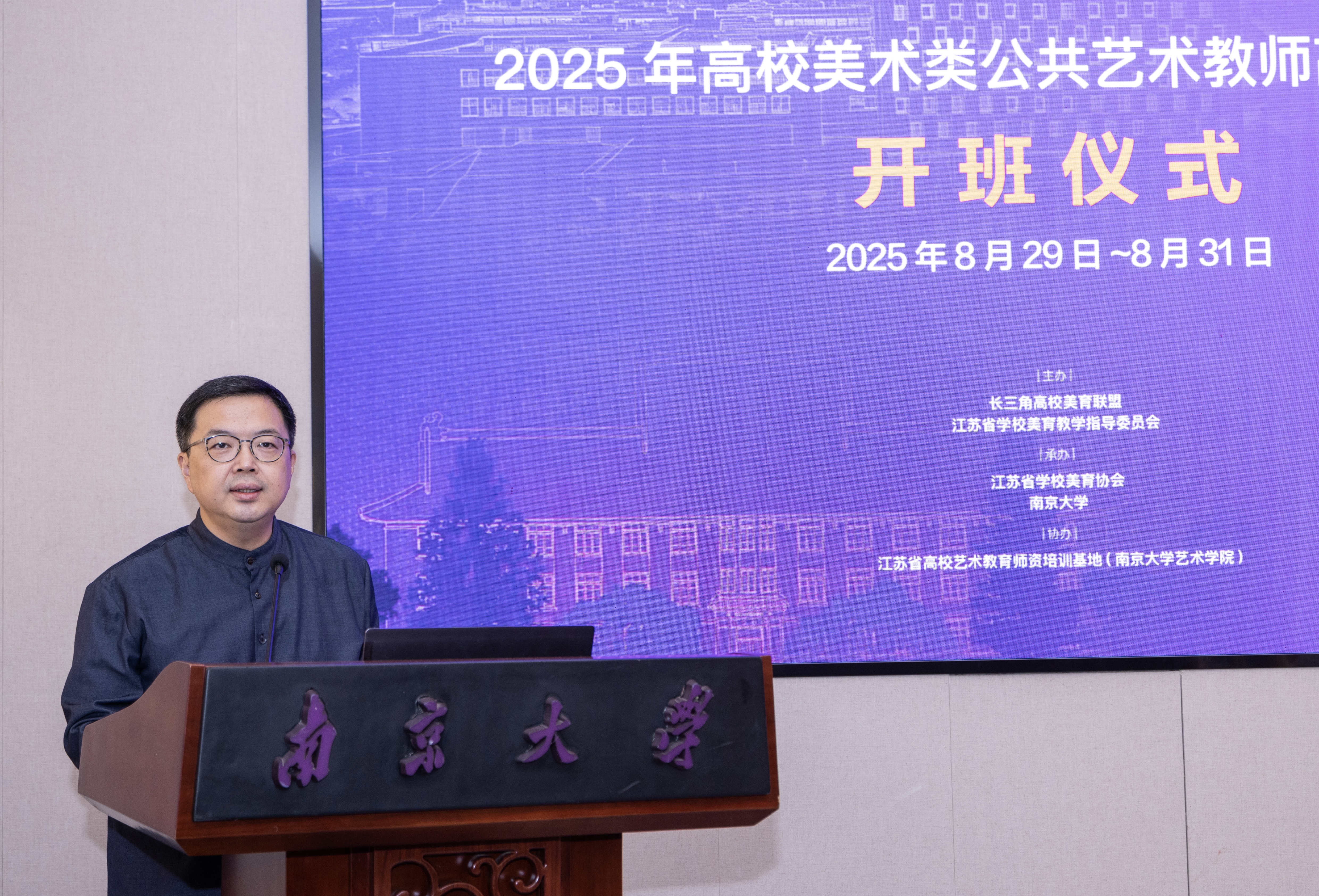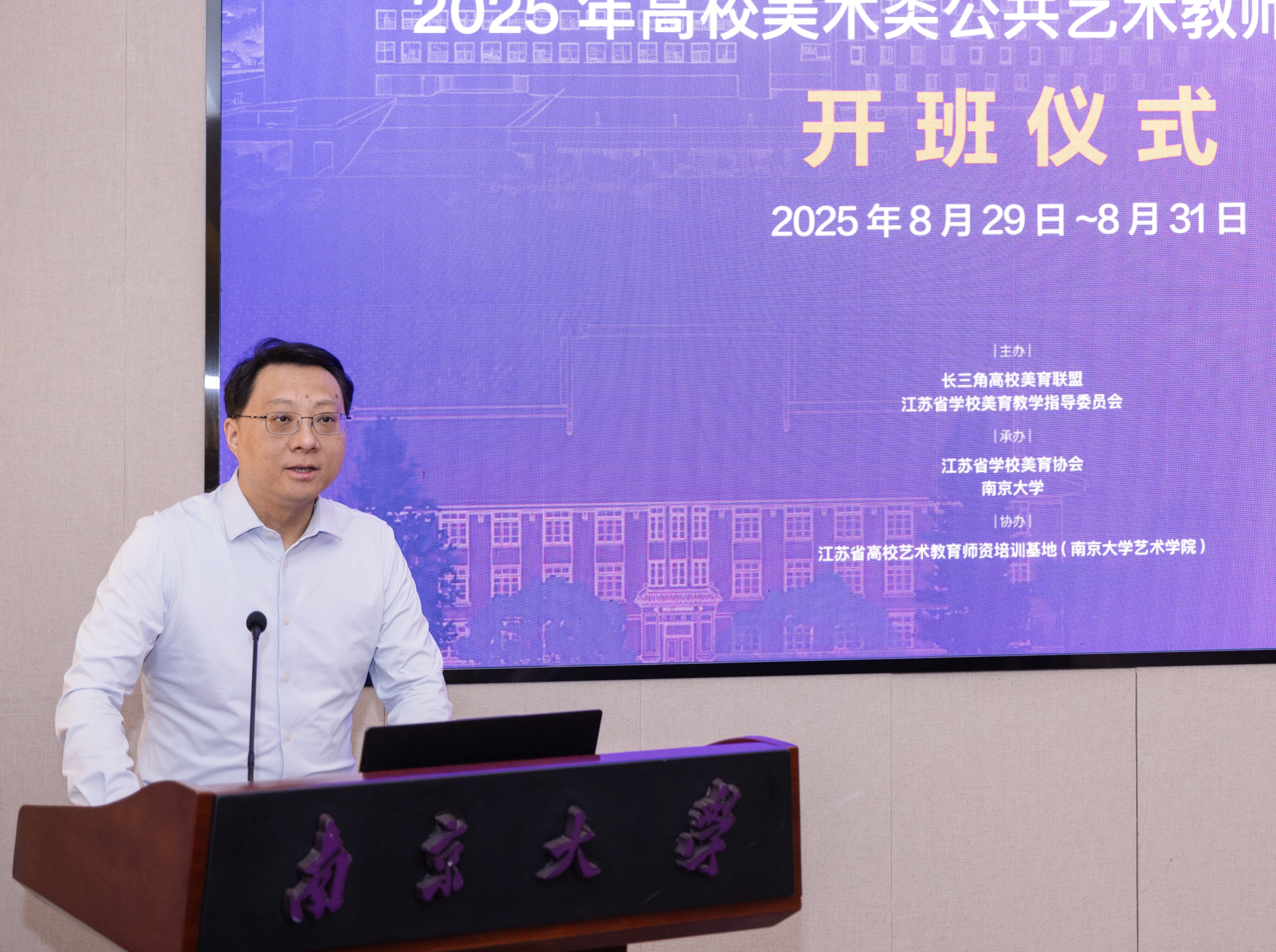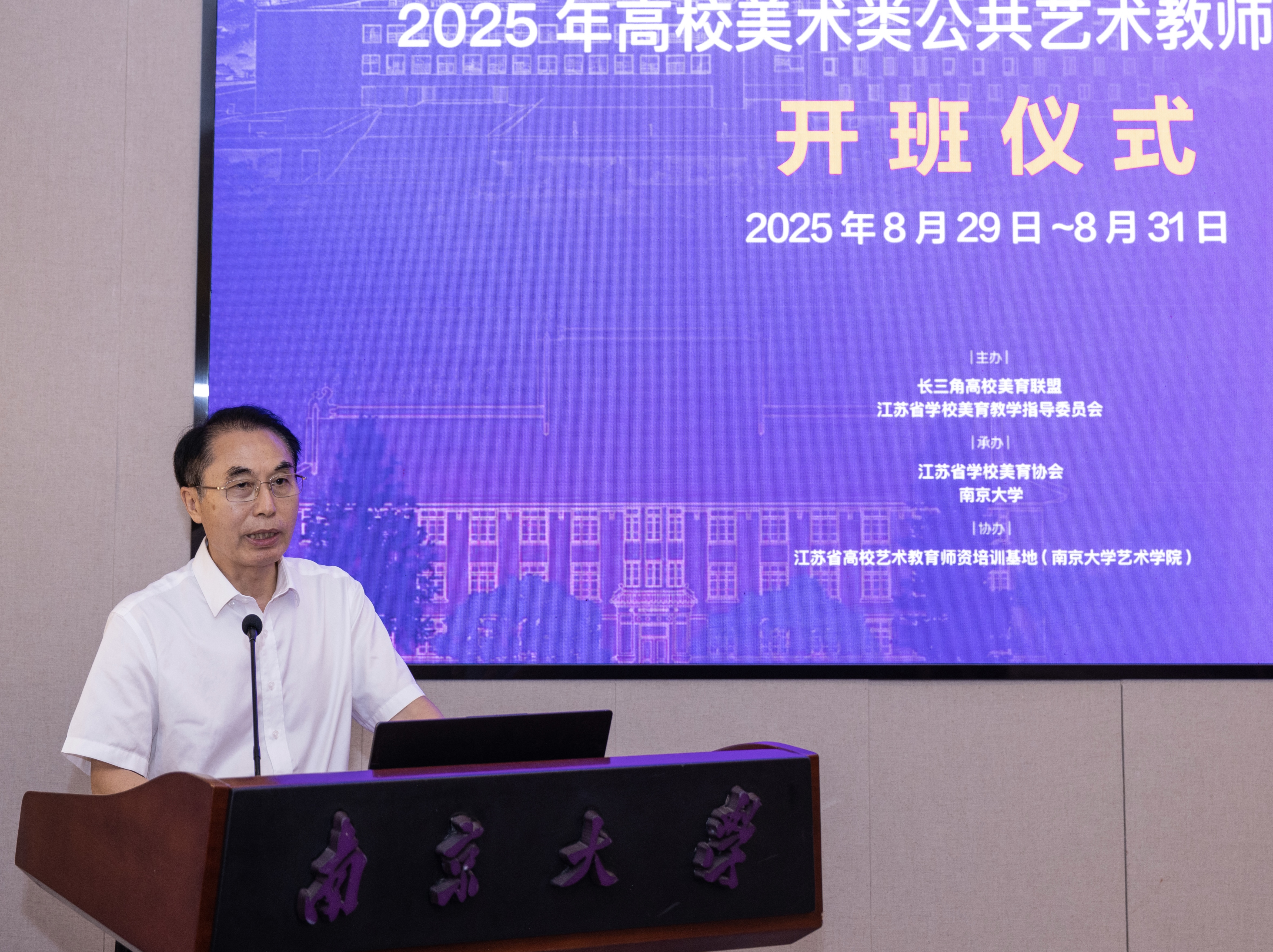 8月29日上午,以“大美育人 艺路同行”为主题的2025年高校美术类公共艺术教师高级研修班开班仪式在南京大学国际会议中心中大报告厅隆重举行。来自江苏、上海、浙江、安徽四地高校的六十余名美术类公共艺术教师参加培训。