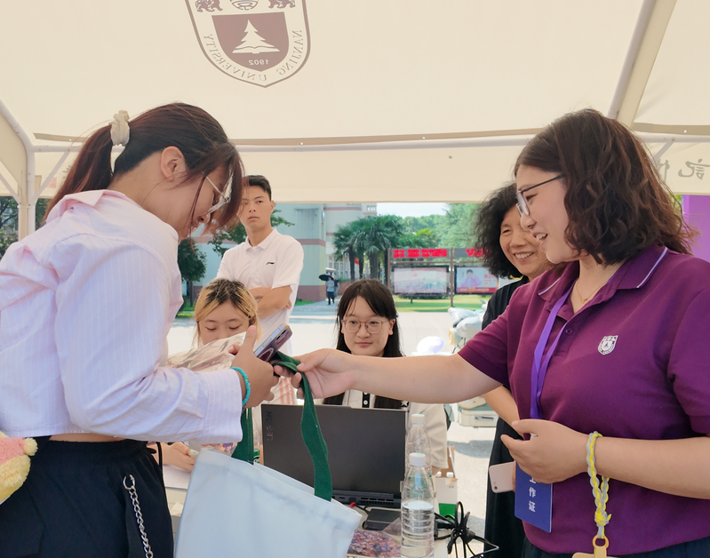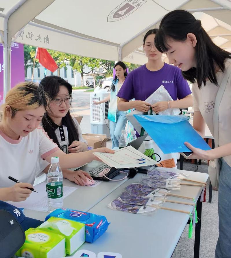 迎新现场,校领导的到来为秋意添了浓情。南京大学党委副书记、纪委书记刘淼来到艺术学院迎新报到点,与报到的新生亲切交流,并向忙碌的志愿者致以问候:“大家辛苦了,记得轮换歇一歇,多补充水分。” 随后被学院文创吸引,拿起印有学院老师代表作的定制扇子细看,点头赞许:“既有专业特色,又兼顾实用!”暖阳漫洒,南京大学副校长周志华在艺术学院新生礼包展示区前驻足,倾听辅导员陈小青介绍:“迎新礼包中的冰箱贴复刻了学院聂危谷、陆庆龙等老师的代表作品,帆布袋和笔记本印着学院标志,每一件物品都像是打开艺术学院的钥匙,拉近新生与学院的距离。” 周志华在了解新生礼包设计理念后,寄语新生:“希望你们带着这份‘艺术礼物’,在南大不仅学好专业知识,更学会用艺术观察生活、服务社会,让艺术成为温暖人心的力量”。并叮嘱现场师生:“迎新工作既要讲效率,更要重温度,大家轮换休息,别让新生等太久。”