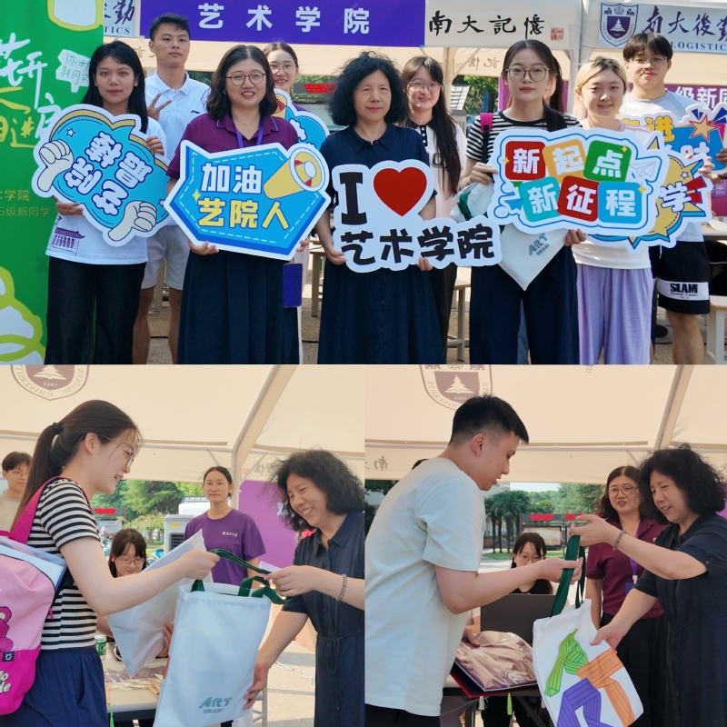 在浦口校区迎新现场,南京大学艺术学院院长赵奎英手持学院精心准备的新生礼包,在报到区域等候新生。今年,学院为新生准备的新生礼包内有以学院聂危谷老师、陆庆龙老师画作为素材的系列冰箱贴,以及学院定制帆布袋和笔记本,希望通过学院文创周边,帮助新生快速建立对学院的认知和情感联结,增强新生认同感,传承学院艺术底蕴。期间,赵奎英院长还亲切慰问现场志愿者,对大家的辛勤付出表示肯定。艺术学院辅导员陈小青同步参与迎新工作,协助发放新生礼包,并向新生说明后续可提供的学习生活支持,切实让新生感受到学院关怀。