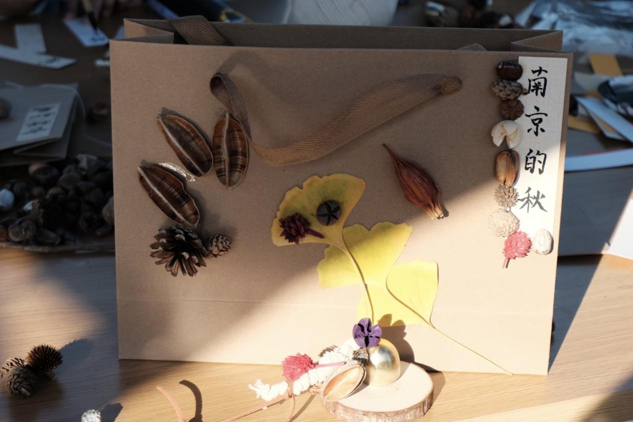以橡果风铃的制作为核心,结合手绘纸袋装饰,为大家提供了一个释放艺术灵感与感受季节之美的机会。同学们在负责人的引导下,从捡拾秋天的橡果、叶片等自然元素开始,用手工串制风铃。纸袋上,艺术学院的学子充分发挥专业特长,将书法与秋日手作相结合,书写的南京之秋、绘制的卡通图案与小橡果、树叶们完美的融合在一起。制作过程中,大家沉浸于手作的乐趣中,感受着秋天的静谧与温暖。