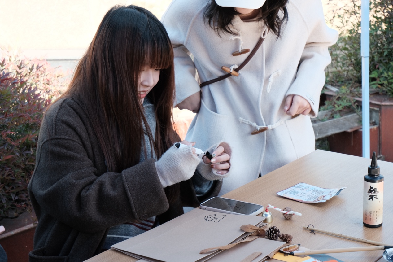 在暖阳的映衬下,银杏圣诞树与玫瑰花展台也吸引了不少同学的参与。参与者巧妙的将一片片银杏叶围绕着树枝,制作成玫瑰花的造型,每一片叶子经过精心的折叠与排列,呈现出花瓣层叠的细腻质感,银杏的金黄与玫瑰的优雅完美结合。这些“银杏玫瑰”象征着秋冬交替中的生命韵律,也传递出大家对自然的赞美与对艺术创作的热忱,看着用心完成的手作,同学们的脸上都洋溢着满足与喜悦。