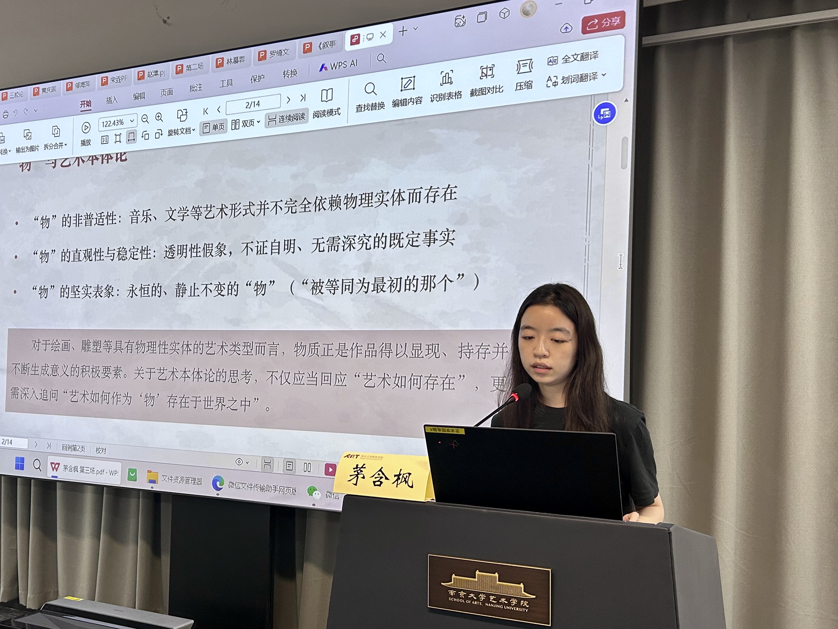 南京大学艺术学院博士研究生陈静弦作为学生代表,表达了自身参与论坛交流的期盼。她谈到,七年以来,三校博士生论坛持续为青年学者搭建对话平台,使艺术学研究者能在与他人和世界持续互动的过程中深化学术研究。她认为,本次论坛主题“物质性、符号与艺术生产”涵盖技法、叙事、物的流动与技术更新等多重维度,并借里尔克的诗句强调,艺术研究应超越定义与归纳,保留开放与神秘,在真诚交流中激发思想新生。
