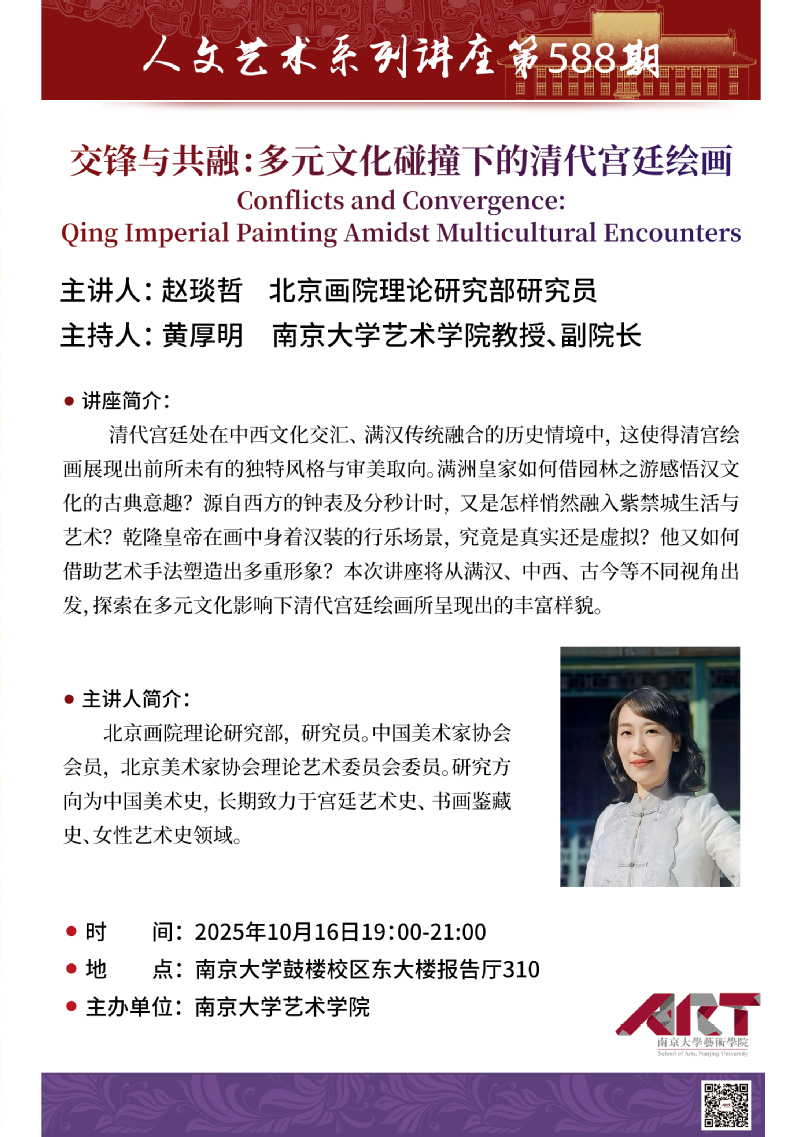清代宫廷处在中西文化交汇、满汉传统融合的历史情境中,这使得清宫绘画展现出前所未有的独特风格与审美取向。满洲皇家如何借园林之游感悟汉文化的古典意趣?源自西方的钟表及分秒计时,又是怎样悄然融入紫禁城生活与艺术?乾隆皇帝在画中身着汉装的行乐场景,究竟是真实还是虚拟?他又如何借助艺术手法塑造出多重形象?本次讲座将从满汉、中西、古今等不同视角出发,探索在多元文化影响下清代宫廷绘画所呈现出的丰富样貌。