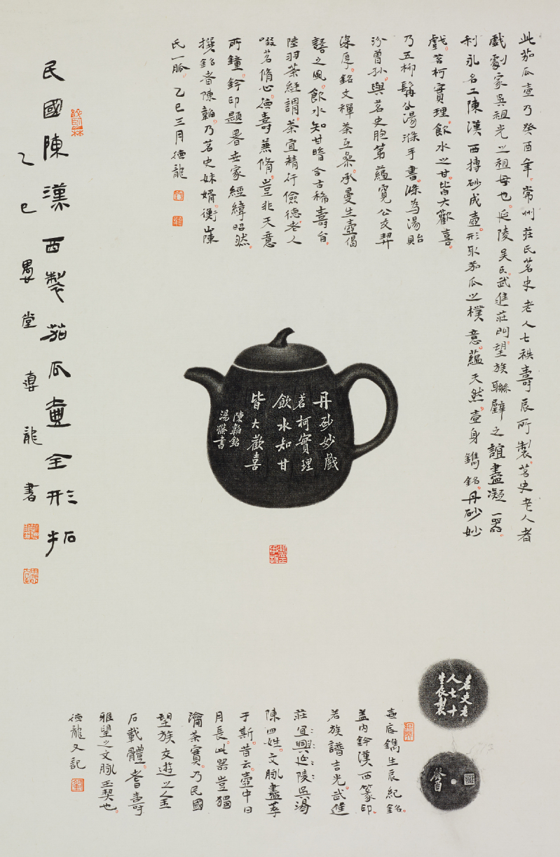 刘德龙教授现为南京大学艺术学院中国画方向硕导,长期致力于金石书画、紫砂艺术及其跨媒介表达研究,著有《紫砂与金石:曼生壶艺术研究》。他提出“以拓为书,以石为心”的艺术理念,强调拓本不止于形,而在于情与志的传达。在本次展出的《自怡轩款陈柏亭制柱础壶拓》中,刘老师以考据结合书写的方式,展现金石艺术中“以物寄志、以拓传心”的人文内涵,折射出他多年来从学术到创作的内在一致性。