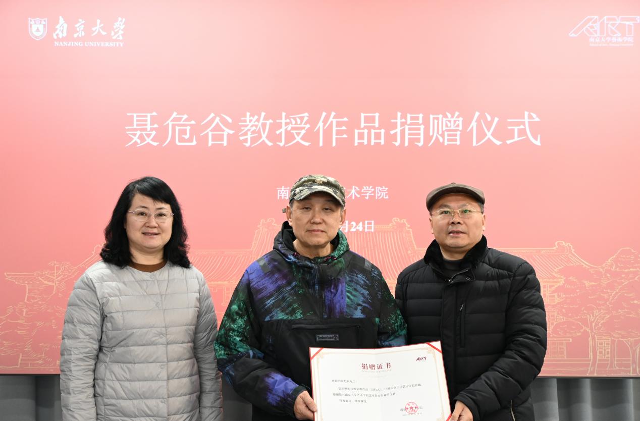 何成洲院长、石红梅书记代表学院接受此次捐赠,作品陈列于南京大学鼓楼校区东大楼。