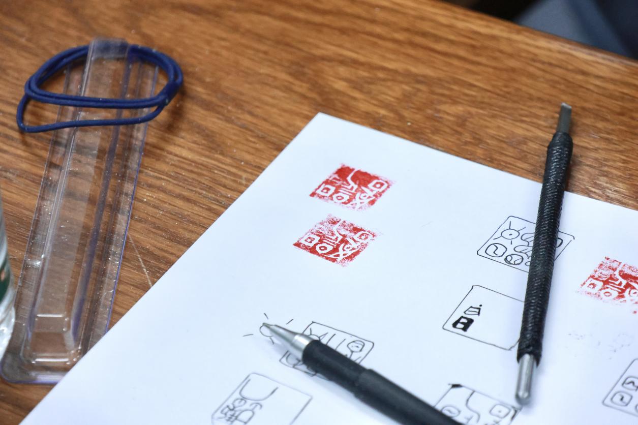 实操体验环节,现场备齐刻刀、印石等全套工具,零基础的同学们在老师的细致指导下逐步上手。参与者们精心挑选设计了富有个性的字体、字形或图案,通过对刻刀的熟悉与驾驭,各自创作出一面面富有特色和韵味的印章。不少同学表示,在主讲人的演示与自己的钻研体会之间,深刻的领会到了篆刻艺术的瑰丽与荣耀,以及其千年不坠的美学密码。当一方方带着个人印记的篆刻作品新鲜出炉时,大家脸上都洋溢着满满的成就感,纷纷展示自己的“第一方印”,分享创作过程中的感悟与收获。