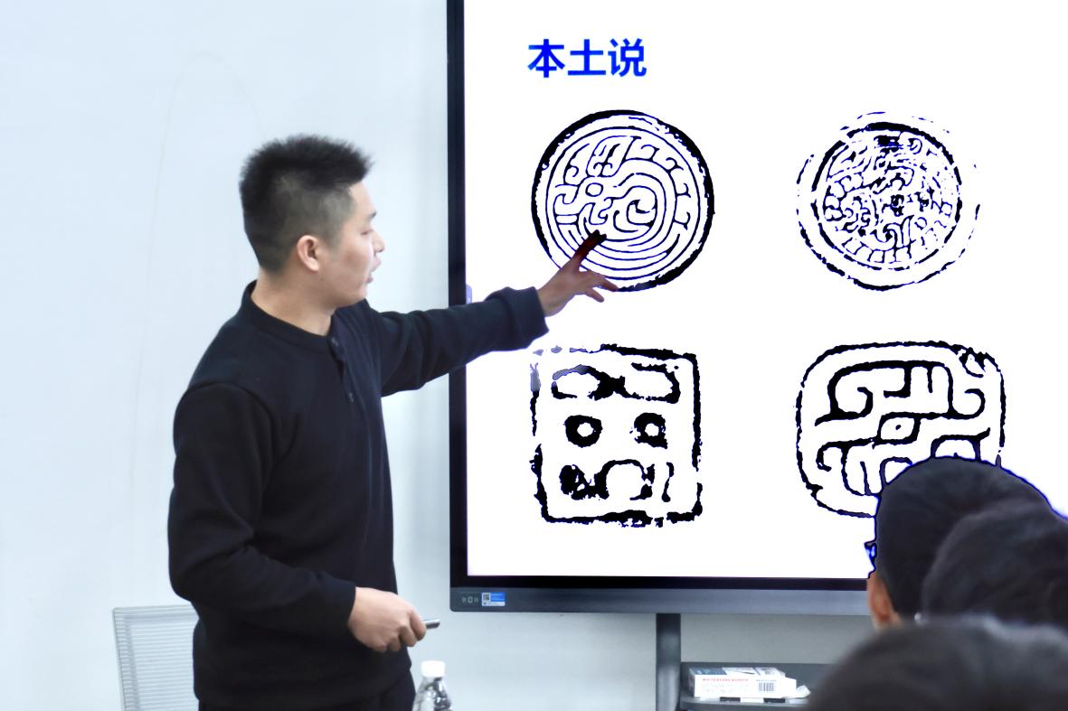 理论分享环节,活动主讲人陈伦乓向大家介绍了篆刻艺术的源流:作为一门成熟的技艺,篆刻的起源同时受到中外文化的影响,一方面中国商周时代就有青铜印信的传统,保存下来的如“瞿甲”“亚禽氏”,而西域传入的封泥则丰富了金石的可塑性。