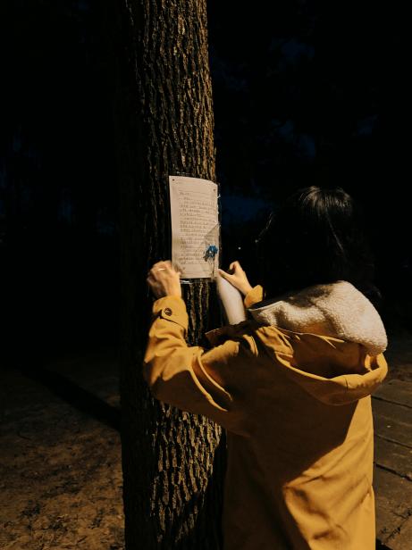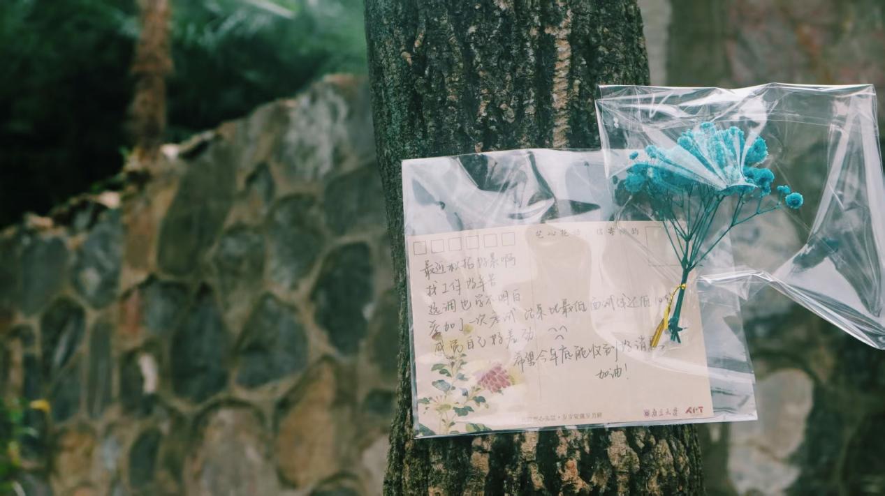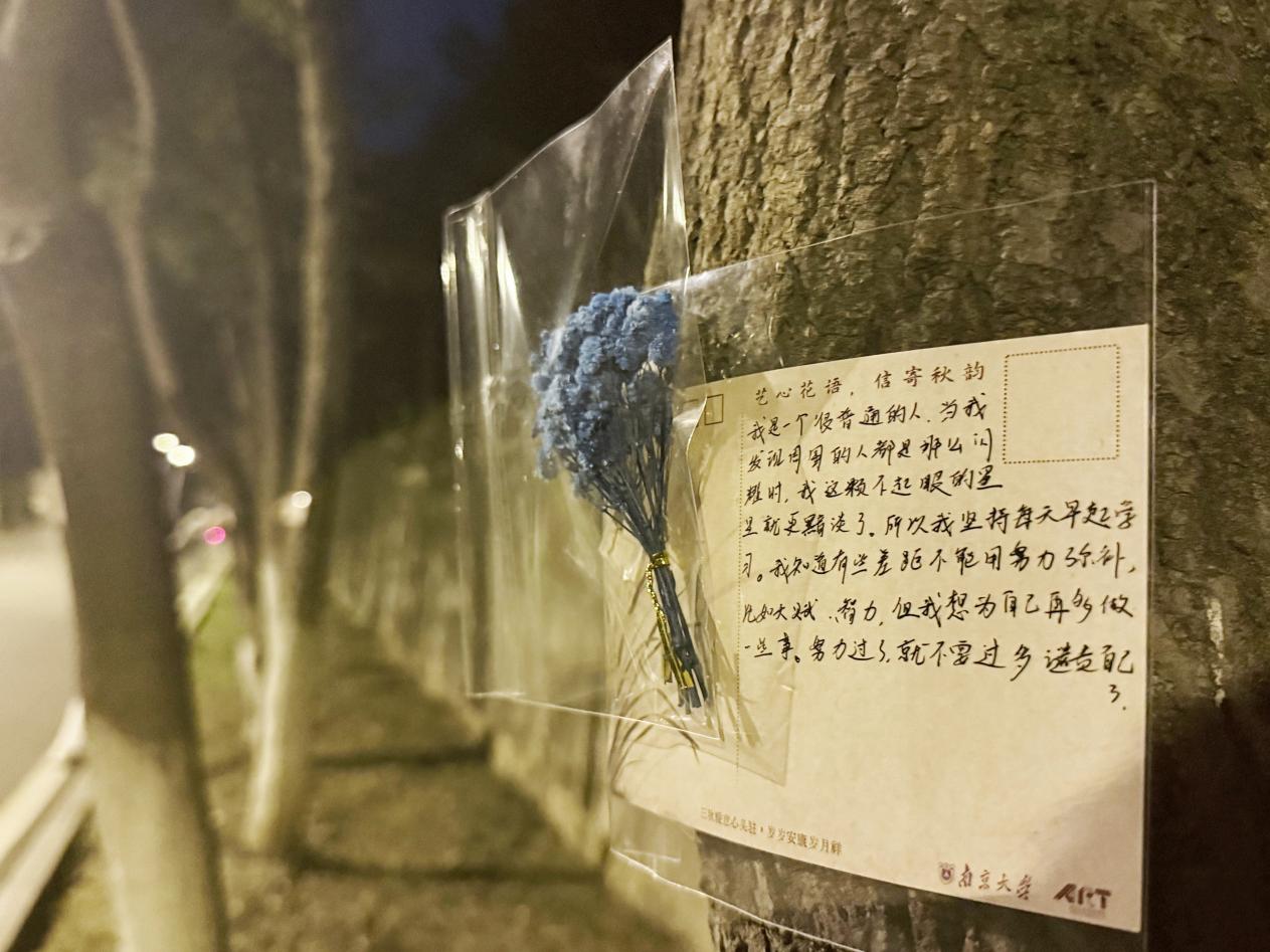 “夜间贴信”是活动最温暖的仪式感。每周三夜晚,工作人员化身“秋日信使”,带着筛选后的匿名信件、防水胶带与精心准备的花朵,将心意粘贴在校园树干 1.5 米处——蓝色系干花(飞燕草、勿忘我)陪伴着烦恼倾诉,像一缕清风抚平焦虑;暖色系鲜花(小雏菊、向日葵)映衬着美好祝福,如秋日暖阳驱散阴霾。