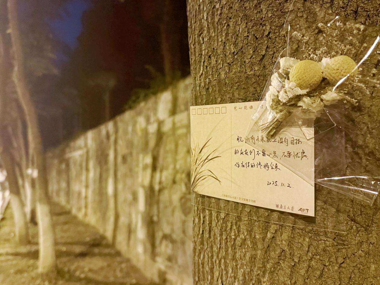 深秋的南京大学浦口校区,层林尽染间藏着一抹别样温柔——由南京大学艺术学院主办的 “艺心花语,信寄秋韵”心理关怀活动,自11月1日启动至12月8日收官,历时一个多月,以“信+花”的创意形式搭建起心灵的桥梁,为学子们送上了一场跨越深秋的治愈之旅,如今已圆满落下帷幕。