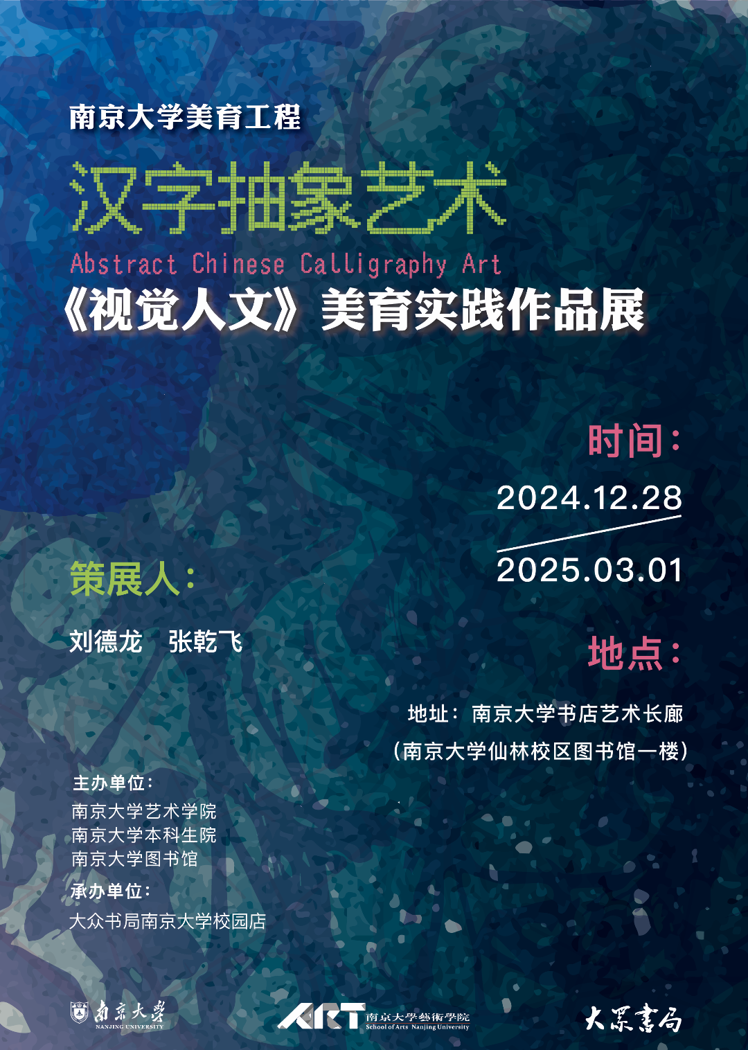近日,由南京大学艺术学院、南京大学本科生院、南京大学图书馆联合主办,大众书局南京大学校园店承办的“汉字抽象艺术——《视觉人文》美育实践作品展”在南京大学杜厦图书馆一楼大众书局艺廊展出。这场别具匠心的展览以“汉字抽象艺术”为主题,集中展现了南京大学本科生在美育课程中的创新实践成果,为观众带来了一场融汇传统文化与现代艺术的视觉盛宴。