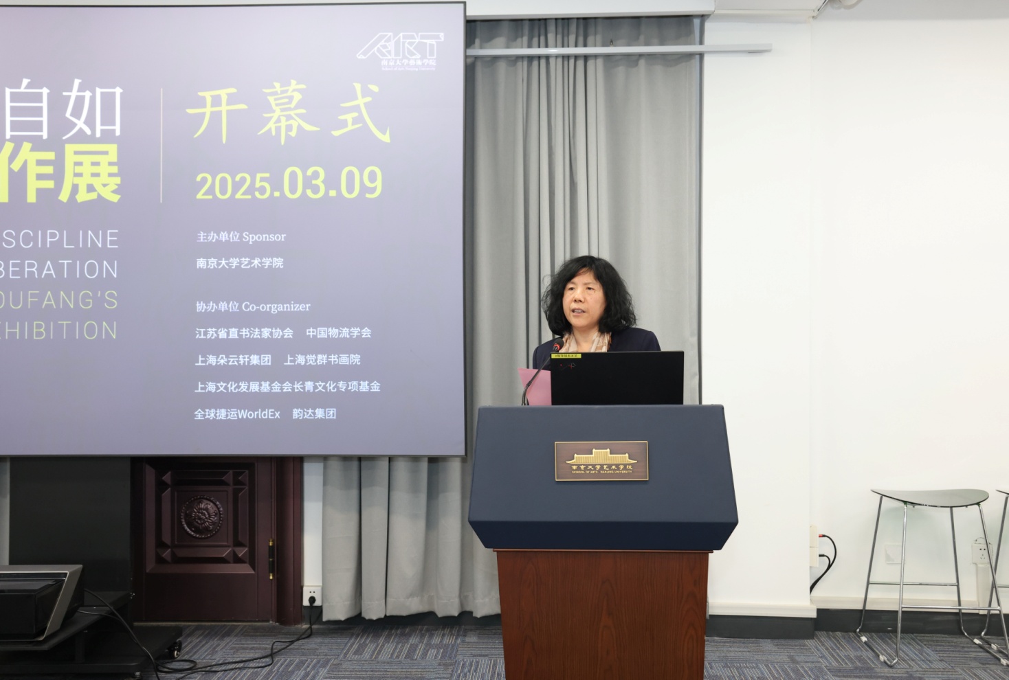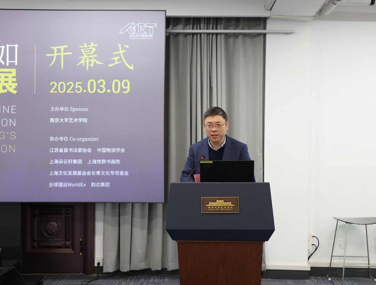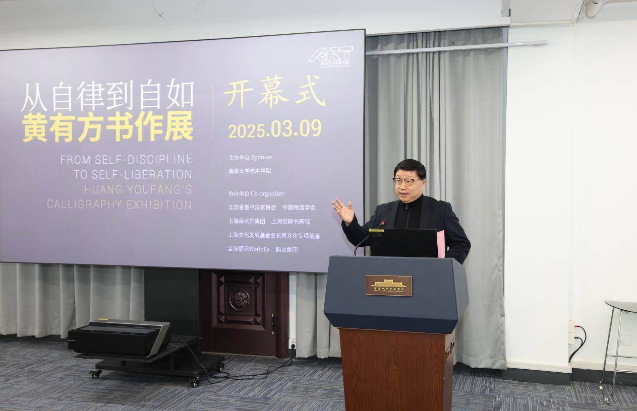 黄有方教授在发言中向南京大学艺术学院,以及所有关心和支持本次展览的各级领导、师生员工致以诚挚的谢意。他表示书法艺术作为中华优秀传统文化的重要组成部分,其研习过程需要持之以恒的坚守与严格的自律修为,唯有通过扎实的基本功训练,方能最终达到艺术创作的自由境界。黄教授强调,本次展览旨在弘扬中华美育精神,期待通过书法艺术的展示与交流,激发青年学子对传统文化的认知与热爱,为书法艺术在高等教育领域的传承与发展注入新的活力。