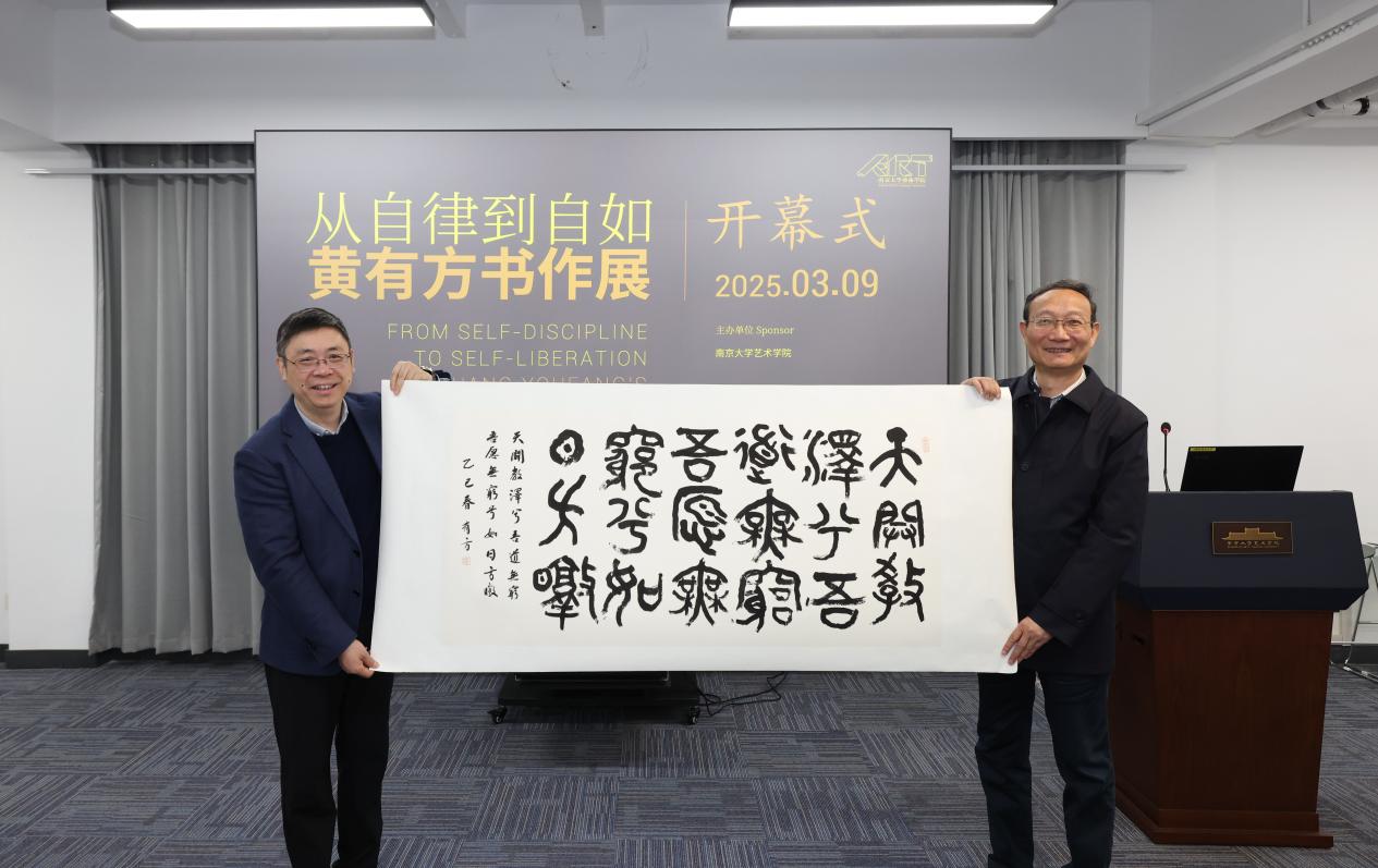 在开幕式的最后环节,举行了隆重的作品捐赠仪式。黄有方教授将书法作品《南京大学校歌》(节选)赠予南京大学,该作品既展现了精湛的艺术造诣,也彰显了南京大学深厚的文化积淀与艺术传承。南京大学副校长陆延青教授代表学校接受捐赠,并对黄有方教授的支持表示衷心感谢。