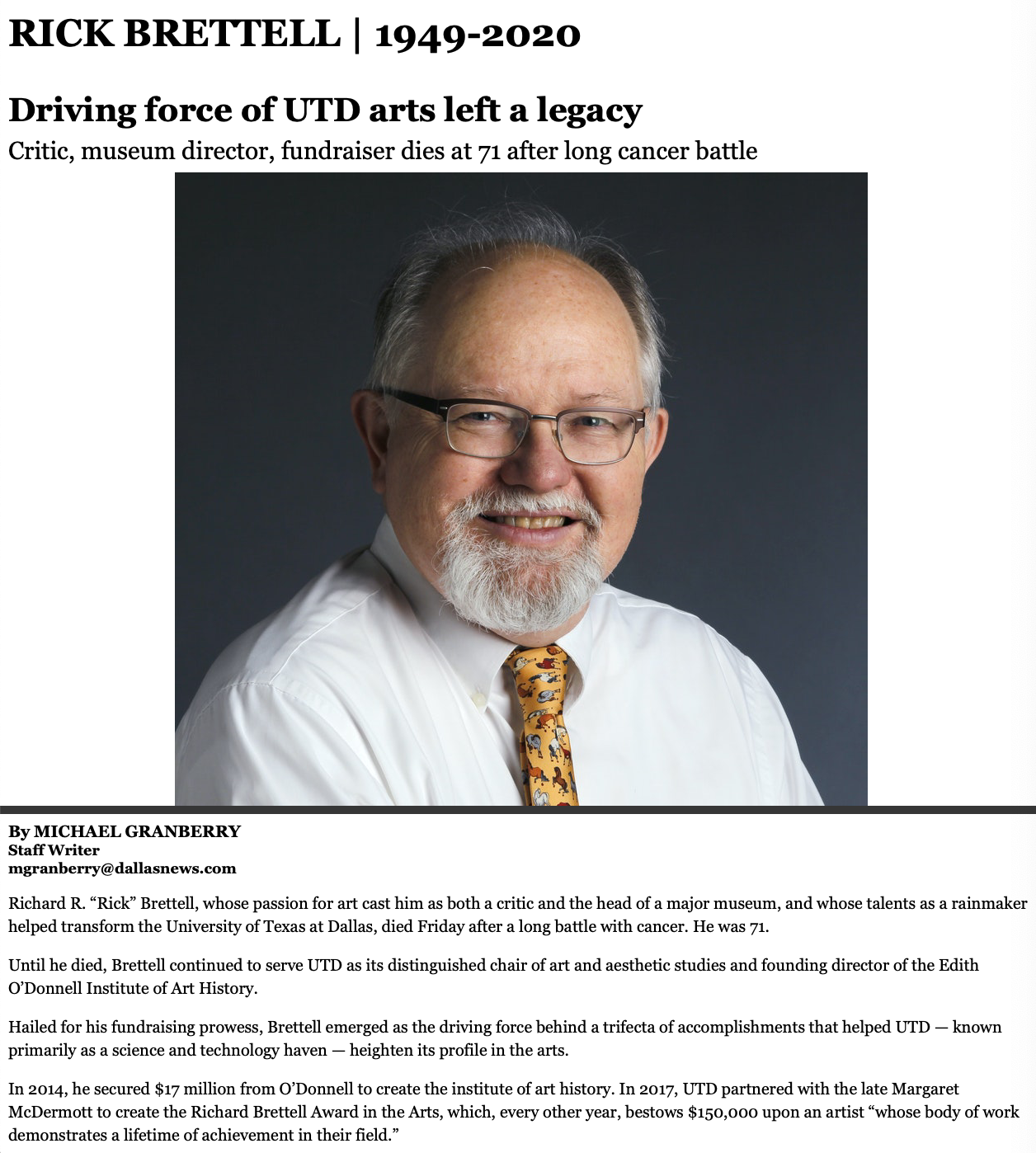 南京大学美国艺术史研究所美方主任理查德·布雷特尔(Richard Brettell)教授于7月24日美国时间下午5点半因病逝世,享年71岁。理查德·布雷特教授是美国德州大学达拉斯分校艺术与美学Margaret M. McDermott特聘讲席教授,以及奥多纳艺术史研究所创始所长和讲席教授。2019年当选为美国艺术与科学院院士。
