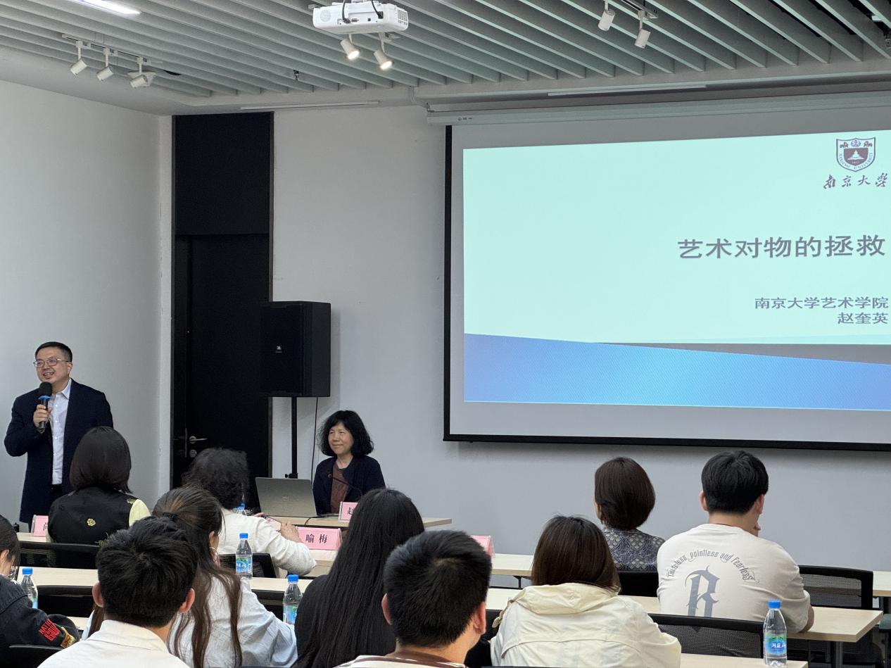 随后,南京大学艺术学院院长赵奎英教授为师生们带来专题讲座《艺术对物的拯救》,以 “技术的发展对物的影响” 为切入点,从“物为何需要拯救”“艺术如何拯救物”“艺术拯救的物是什么”等方面,深入探讨了艺术对物的拯救问题。赵院长指出,现代技术为人类生活带来便利的同时,也引发一系列问题,如图像化泛滥导致人对世界感知的弱化、消费主义盛行造成人对物的情感异化,甚至对生态环境构成严重威胁。在此时代背景下,艺术的多元价值愈发凸显,既需回应现实,也需重塑人与物的关系。通过讲座,团队师生对“语言本质与艺术存在”这一哲学命题有了更深刻的理解。在当今艺术逐渐远离物质世界、趋于概念化的时代,唯有重拾艺术与物质世界的深层联系,才能真正实现“艺术对物的拯救”。
