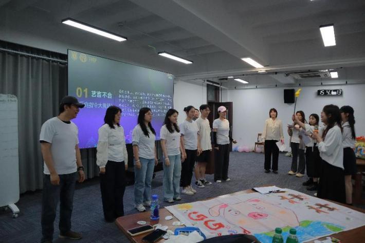 下午15:00,活动在热烈的氛围中拉开序幕,主持人详细介绍赛程安排与规则后,师生们迅速投身于组队、抽签环节。艺术学院的教职工、博士研究生、硕士研究生自由组队,迅速组建起6支风格迥异的参赛队伍,各队充分发挥艺术特长,精心构思队名、绘制队旗,现场创意与欢乐齐飞。“飞黄腾达”队以一段热情奔放的热舞瞬间点燃全场气氛;“花式躺赢队”凭借幽默搞怪的姿态,引得众人捧腹大笑;“壮壮队”用创意十足的口号,成功吸引大家的目光;“兿隊”巧妙借用艺术学院首字,将艺术与创意完美融合;“对对队”队员们默契配合、妙语连珠,上演了一场精彩的语言互动;“最美不过夕阳红”队身着亮眼的暖红色队服,宛如天边绚丽的晚霞,一亮相就成为焦点。各队各显神通,充分展现出艺术学院师生昂扬向上、朝气蓬勃的精神面貌。随后,艺术学院院长、党委副书记赵奎英宣布运动会开幕,将现场氛围推向高潮。