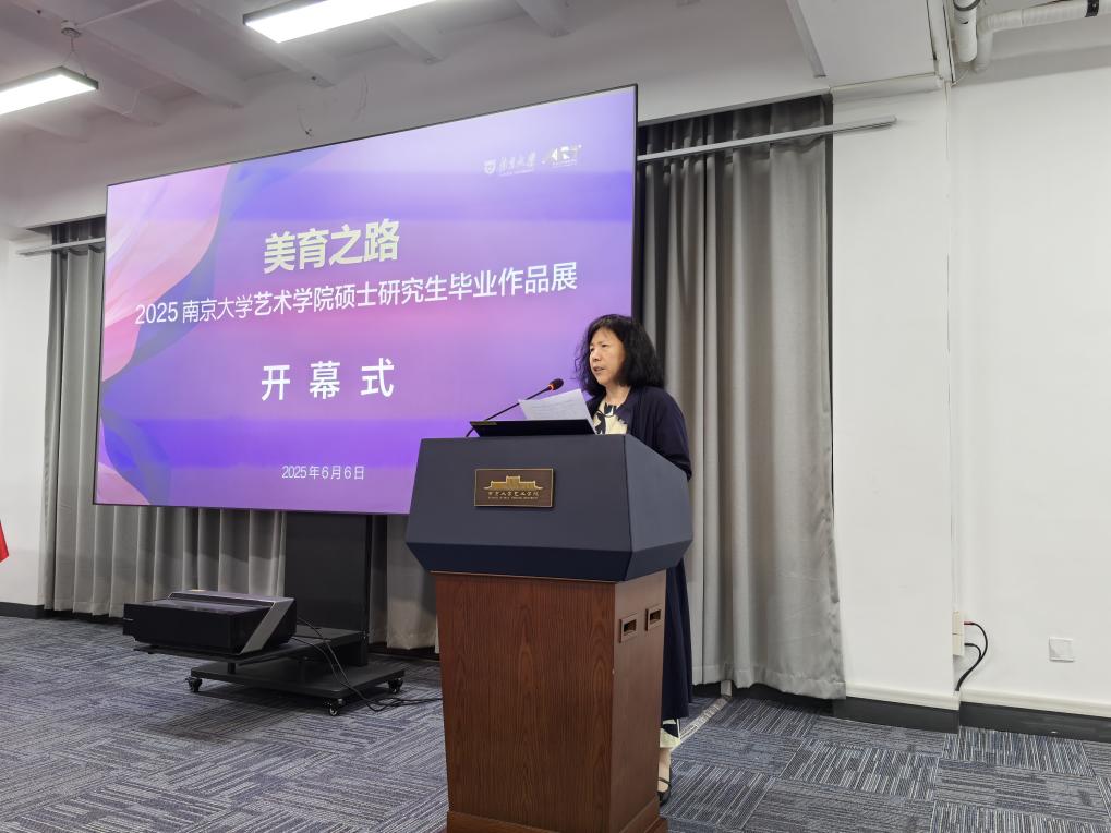 艺术学院院长赵奎英教授在开幕式上发表致辞。她代表学院向莅临开幕式的嘉宾表示欢迎,对毕业生表示祝贺,并向指导教师致谢。赵院长表示,本次展览集中呈现了学院创新育人成果,展现了南大“诚朴雄伟”的学术品格。在人工智能时代,学院坚持“守正创新、大美育人”理念,推动理论研究与创作实践深度融合。她勉励毕业生“一切艺术都有诗意的本质,伟大的作品不能缺少理想的光晕”,希望同学们传承南大精神,在艺术道路上勇攀高峰。
