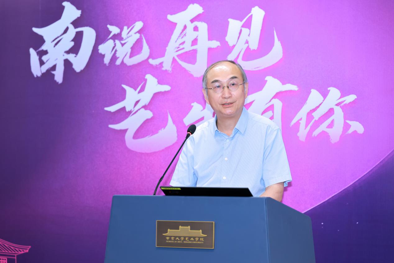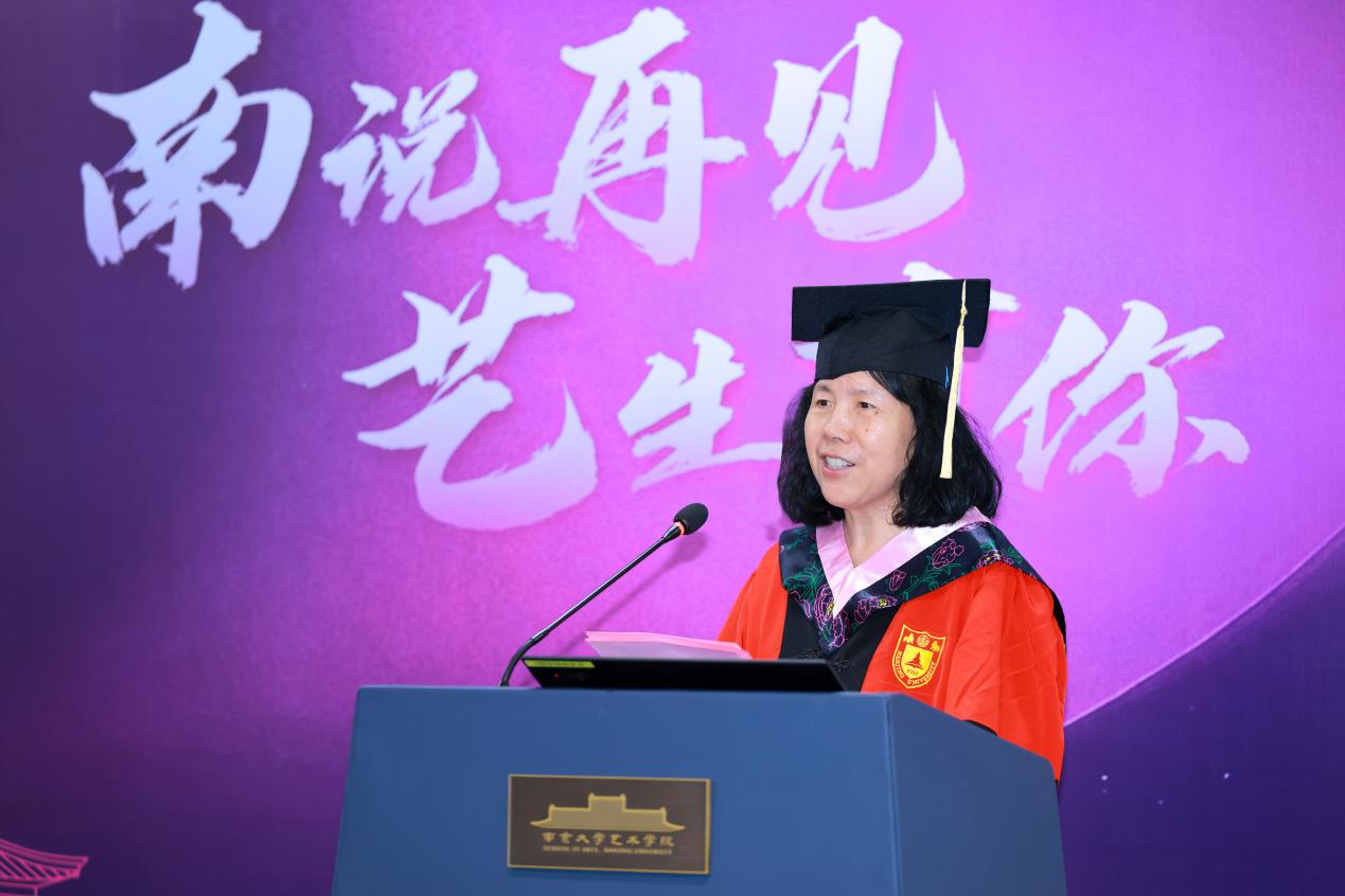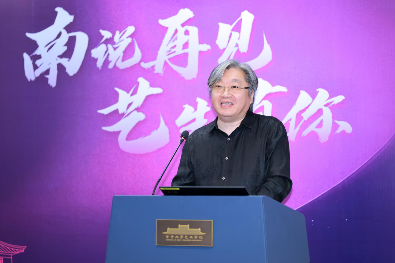 嘉宾寄语,情深意长。南京大学兼职教授、全国教育书画协会名誉会长兼全国高等书法教育分会会长言恭达先生,南京大学硕士研究生行业导师、江苏省政府参事、江苏省书法家协会副主席刘灿铭先生,以及江苏省文化馆党总支书记、馆长赵彦国先生作为嘉宾代表发表致辞,向毕业生致以热烈祝贺和美好祝愿。言恭达先生勉励毕业生,要铸造成长力,开拓创造力,并坚定文化自信。刘灿铭先生结合自身跨界经历,倡导毕业生尝试跨界融合,坚持终身学习,注重德艺双修等等。赵彦国先生分享了与南大艺术学院的深厚渊源,期待毕业生积极播撒美育星火,在不同领域守护艺术的光芒。