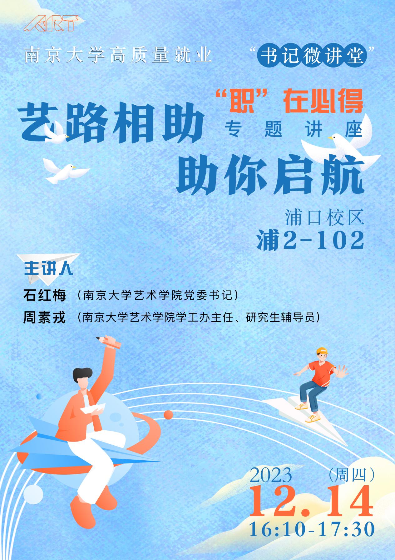 为深入推进“奋进行动”,积极服务国家重大战略需求,引导学生以报效国家、服务人民为自觉追求,12月14日下午,艺术学院于浦口校区举办“书记微讲堂”——“艺路相助 助你启航”专题讲座,党委书记石红梅与学工办主任周素戎担任主讲人。活动由艺术学院2022级团支部、2023级团支部承办。