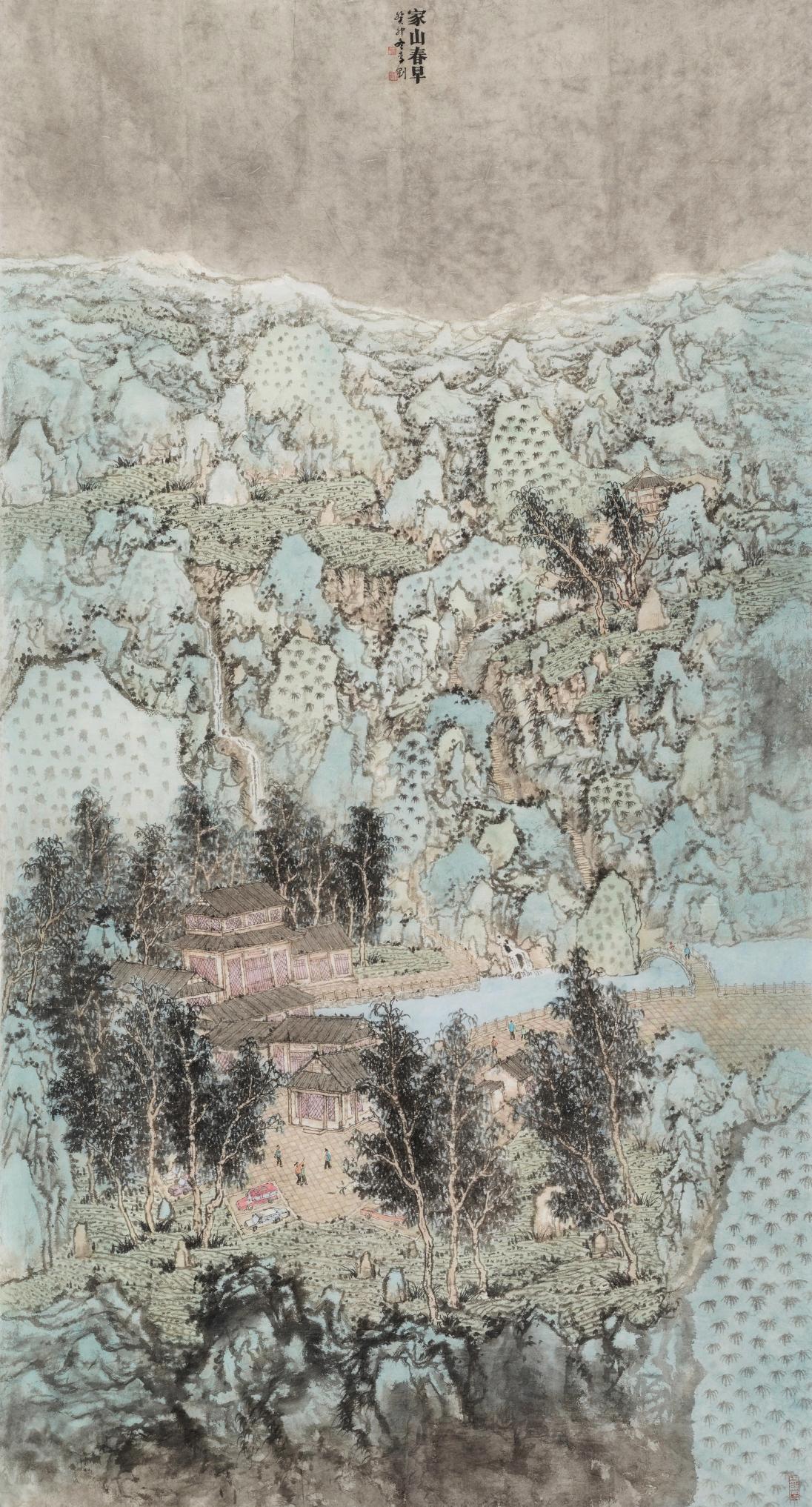 李刚浸淫传统山水画多年,深研历代诸家,尤重董源一脉南宗源流;于近现代则倾心于陆俨少云水流韵、黄宾虹浑厚华滋,此二者与其温厚性情及水乡生活体悟相契相融,逐渐淬炼出渊源深厚且颇具个性的笔墨语言。其近年新作《灵龙水乡淮杂故里》、《大美九龙口》等系列,以平远视角聚焦家乡建湖风物─芦荡滩涂、舟楫渔网、村落农人、走兽飞鸟交织成一幅幅“村在水中筑,人在荡中游”的农家生活场景。其笔墨松动氤氲,层次丰沛华滋,水乡温润气息跃然纸上。青绿之作如《青山幽居》,追求墨彩天然契合,格调淡雅清新;《岁月静好》则另辟蹊径,以蕴含装饰美感的形式风格,与精心提炼的生活符号相得益彰。