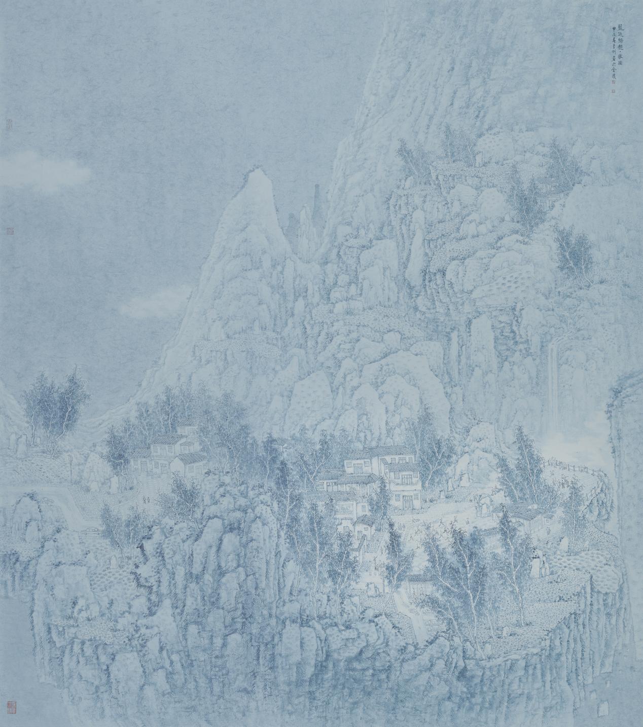 身为年轻画家且拥有着开放心态,李刚关注现当代艺术潮流并善于适当吸纳,籍以推进绘画的单纯性而化繁为简。如《蓝色畅想·家园》中,巧妙运用“清水云龙”纸与花青撞水的渗化纹理,在营造丰富视觉层次与空灵意境之同时,融入平面构成之简练。李刚遍迹南北各地,以敦厚而松灵之笔描绘齐鲁雄峰、苏北芦荡与江南园林等地域风貌与神采。其画面渐由具象而升华为意象,笔墨则由写实而渐入虚灵之境。“画为心迹,境由心生”,李刚从不满足于现状而乐于精进不止。其表现愈趋成熟而手法时有新变。但其作品内质则始终如一,正是温文尔雅、淡然闲适个性之写照,于平淡冲和中蕴涵着雅健清逸之气。