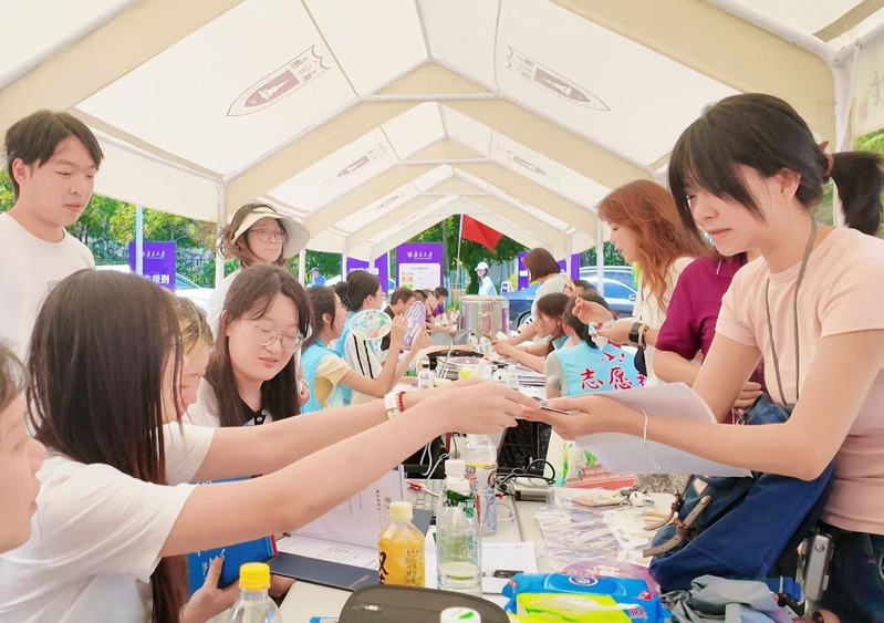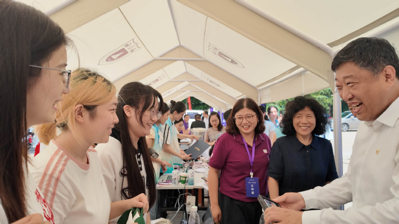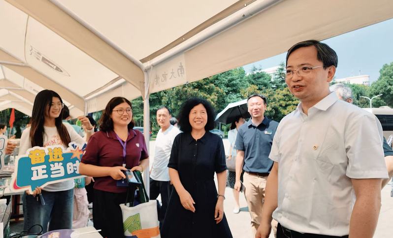 迎新现场,校领导的到来为秋意添了浓情。南京大学党委副书记、纪委书记刘淼来到艺术学院迎新报到点,与报到的新生亲切交流,并向忙碌的志愿者致以问候:“大家辛苦了,记得轮换歇一歇,多补充水分。” 随后被学院文创吸引,拿起印有学院老师代表作的定制扇子细看,点头赞许:“既有专业特色,又兼顾实用!”暖阳漫洒,南京大学副校长周志华在艺术学院新生礼包展示区前驻足,倾听辅导员陈小青介绍:“迎新礼包中的冰箱贴复刻了学院聂危谷、陆庆龙等老师的代表作品,帆布袋和笔记本印着学院标志,每一件物品都像是打开艺术学院的钥匙,拉近新生与学院的距离。” 周志华在了解新生礼包设计理念后,寄语新生:“希望你们带着这份‘艺术礼物’,在南大不仅学好专业知识,更学会用艺术观察生活、服务社会,让艺术成为温暖人心的力量”。并叮嘱现场师生:“迎新工作既要讲效率,更要重温度,大家轮换休息,别让新生等太久。”