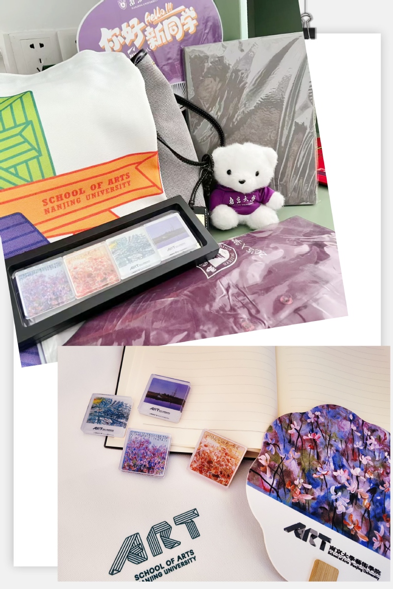 在浦口校区迎新现场,南京大学艺术学院院长赵奎英手持学院精心准备的新生礼包,在报到区域等候新生。今年,学院为新生准备的新生礼包内有以学院聂危谷老师、陆庆龙老师画作为素材的系列冰箱贴,以及学院定制帆布袋和笔记本,希望通过学院文创周边,帮助新生快速建立对学院的认知和情感联结,增强新生认同感,传承学院艺术底蕴。期间,赵奎英院长还亲切慰问现场志愿者,对大家的辛勤付出表示肯定。艺术学院辅导员陈小青同步参与迎新工作,协助发放新生礼包,并向新生说明后续可提供的学习生活支持,切实让新生感受到学院关怀。