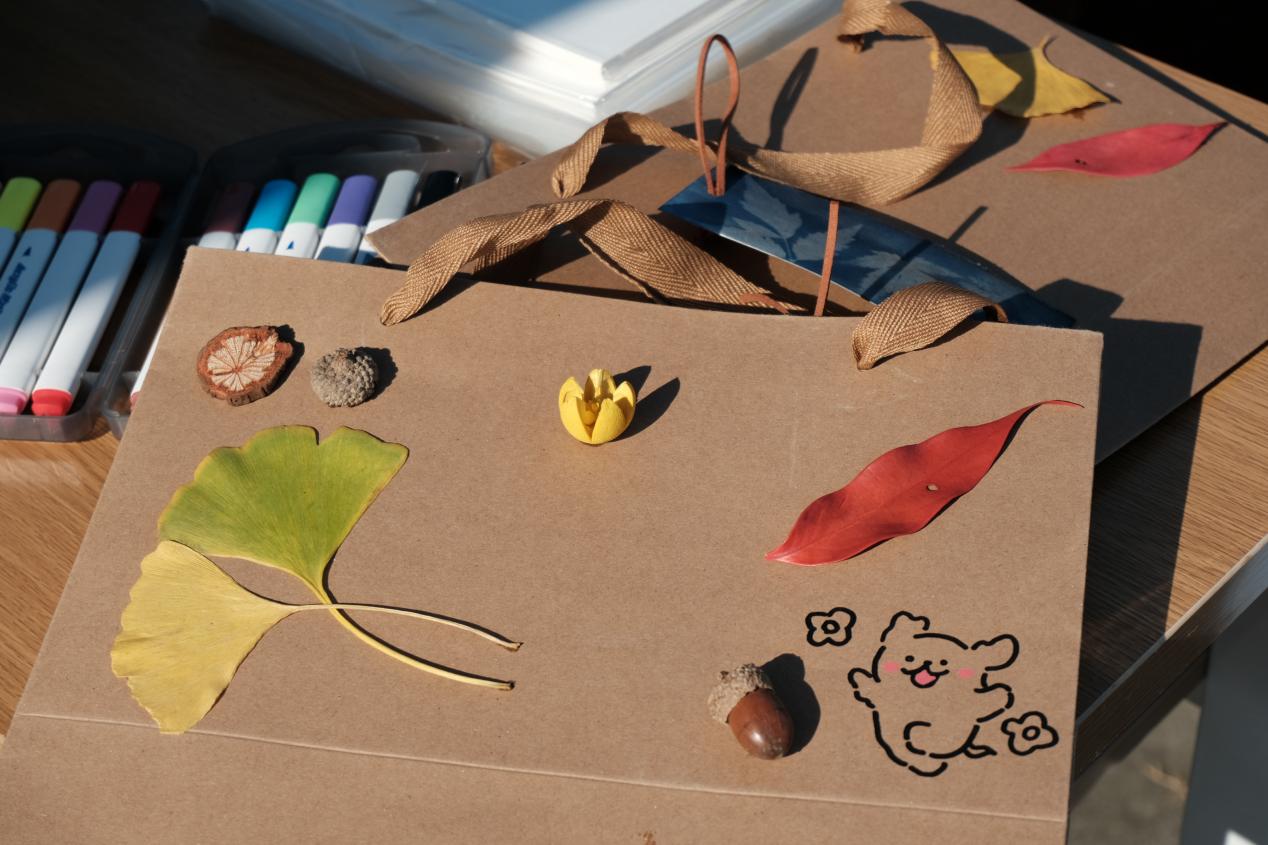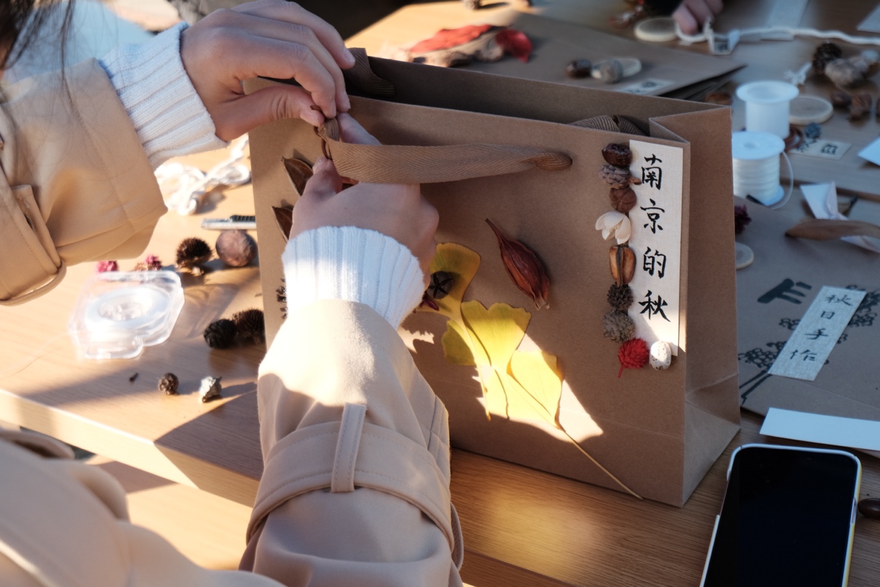 以橡果风铃的制作为核心,结合手绘纸袋装饰,为大家提供了一个释放艺术灵感与感受季节之美的机会。同学们在负责人的引导下,从捡拾秋天的橡果、叶片等自然元素开始,用手工串制风铃。纸袋上,艺术学院的学子充分发挥专业特长,将书法与秋日手作相结合,书写的南京之秋、绘制的卡通图案与小橡果、树叶们完美的融合在一起。制作过程中,大家沉浸于手作的乐趣中,感受着秋天的静谧与温暖。
