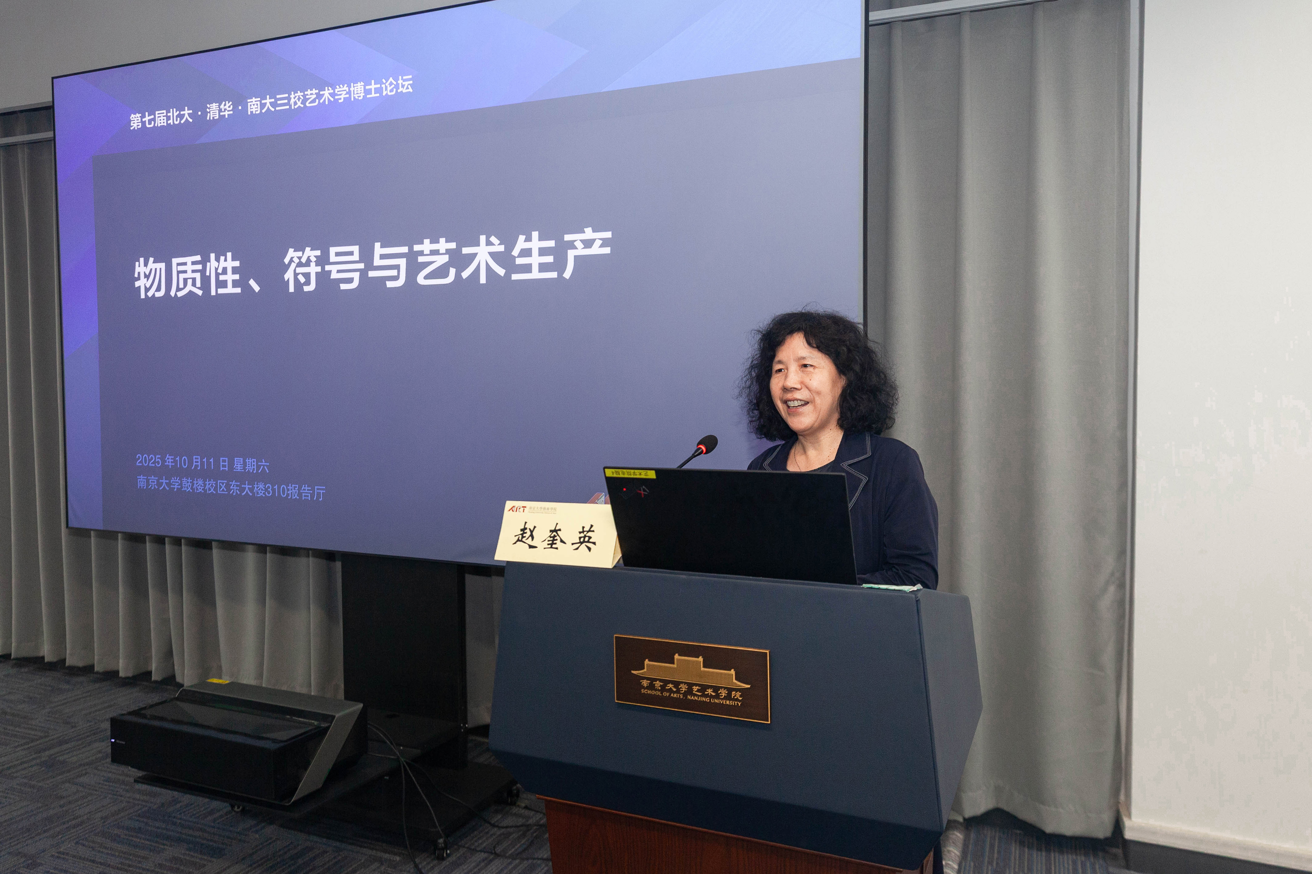 赵奎英教授代表南京大学艺术学院对与会师生表示热烈欢迎,并对论坛组织团队致谢。她指出,本届论坛主题“物质性、符号与艺术生产”紧扣学科前沿,涉及艺术本体存在的核心议题,在“去物质化”与“符号化”交织的当代语境中尤具探讨价值。她期待与会博士生在交流中激发思想、深化友谊,共同推动艺术学研究的进步。