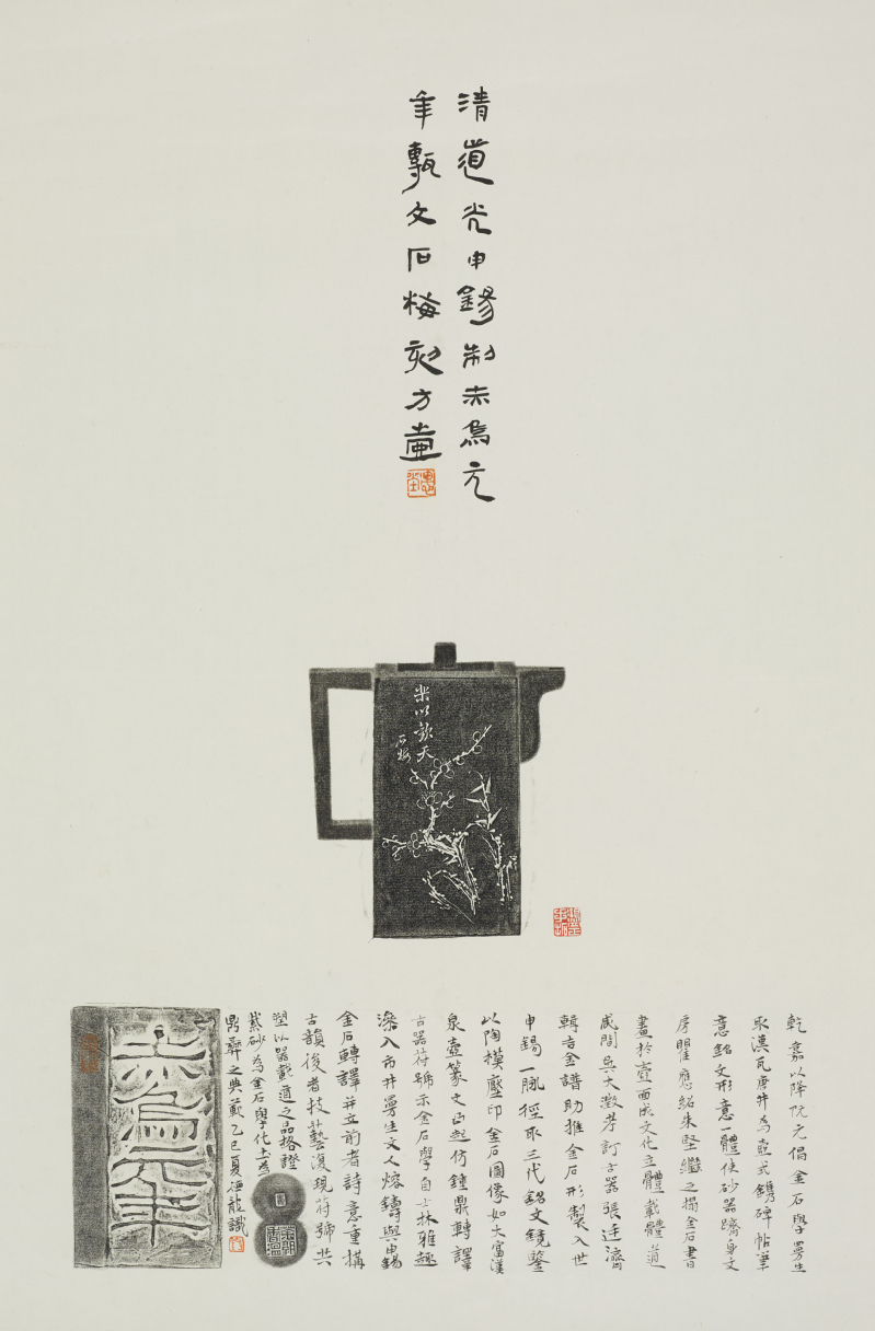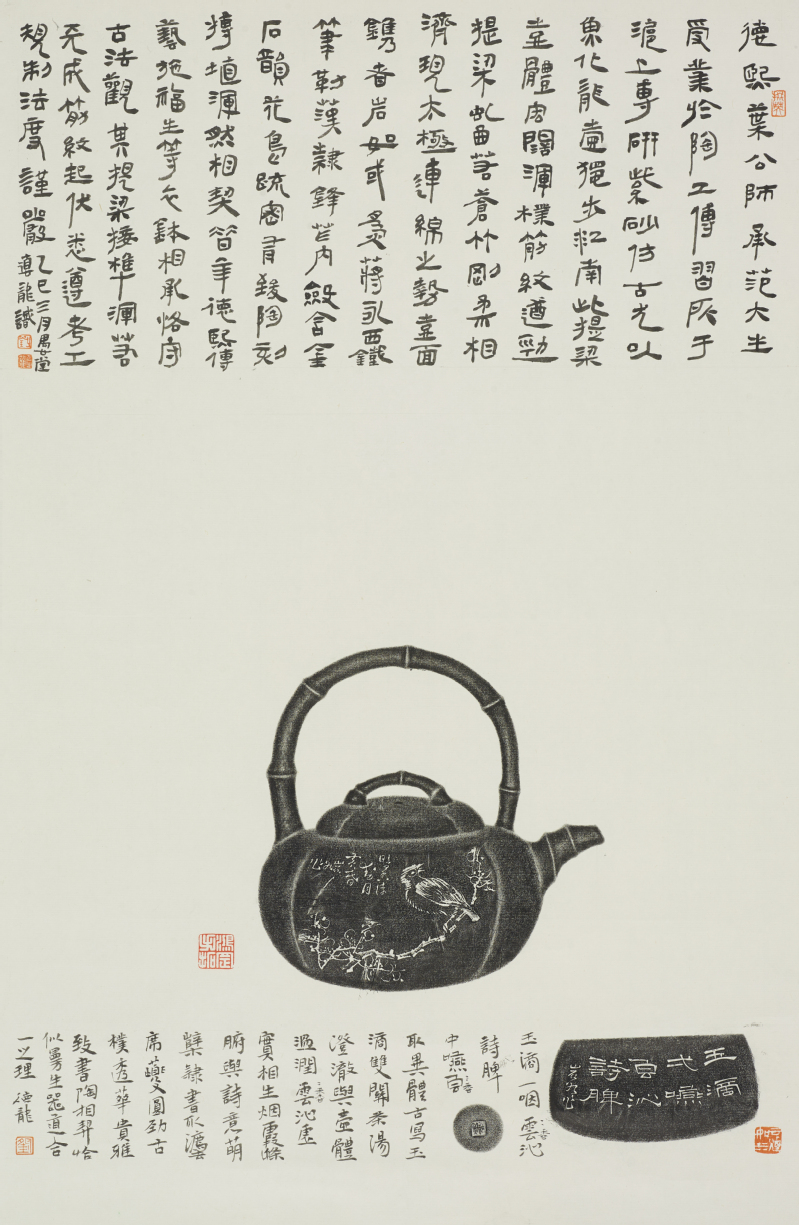 刘德龙教授现为南京大学艺术学院中国画方向硕导,长期致力于金石书画、紫砂艺术及其跨媒介表达研究,著有《紫砂与金石:曼生壶艺术研究》。他提出“以拓为书,以石为心”的艺术理念,强调拓本不止于形,而在于情与志的传达。在本次展出的《自怡轩款陈柏亭制柱础壶拓》中,刘老师以考据结合书写的方式,展现金石艺术中“以物寄志、以拓传心”的人文内涵,折射出他多年来从学术到创作的内在一致性。