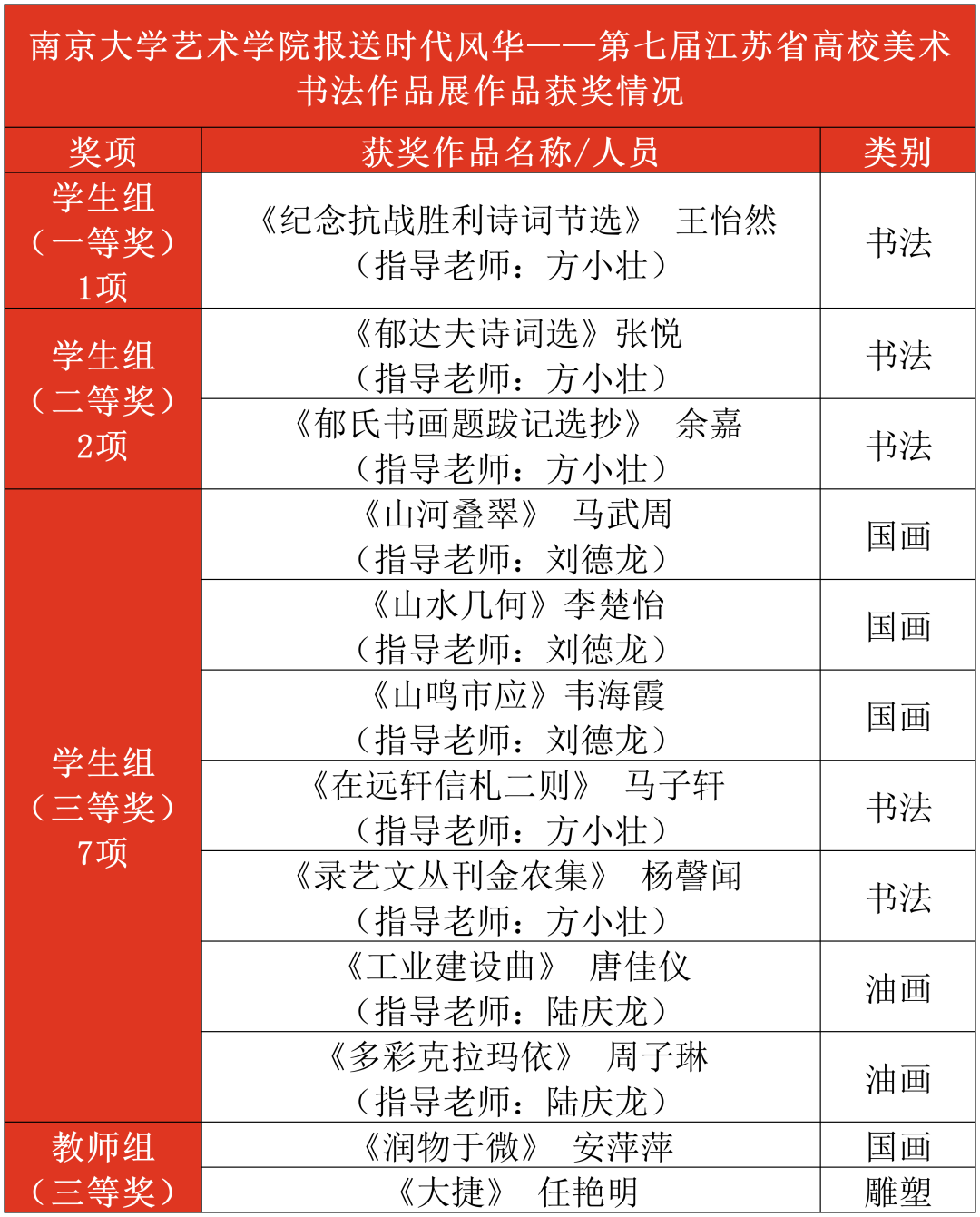 近日,“时代风华——第七届江苏省高校美术书法作品展”圆满落下帷幕。我院报送的绘画、书法与雕塑等作品在本次活动中表现优异。学院高度重视、统筹推进本次展演活动,围绕立德树人根本任务,聚焦时代主题与艺术创新,遴选优秀作品参展。参赛作品在思想性、艺术性与专业性上实现了良好统一,集中体现了我院“以美育人、以文化人”的办学理念与教学成果。在江苏省教育厅公布的第七届大学生艺术展演活动获奖名单中,我院师生共斩获 12项省级奖项,其中学生组一等奖1项、二等奖2项、三等奖7项,教师组三等奖2项。