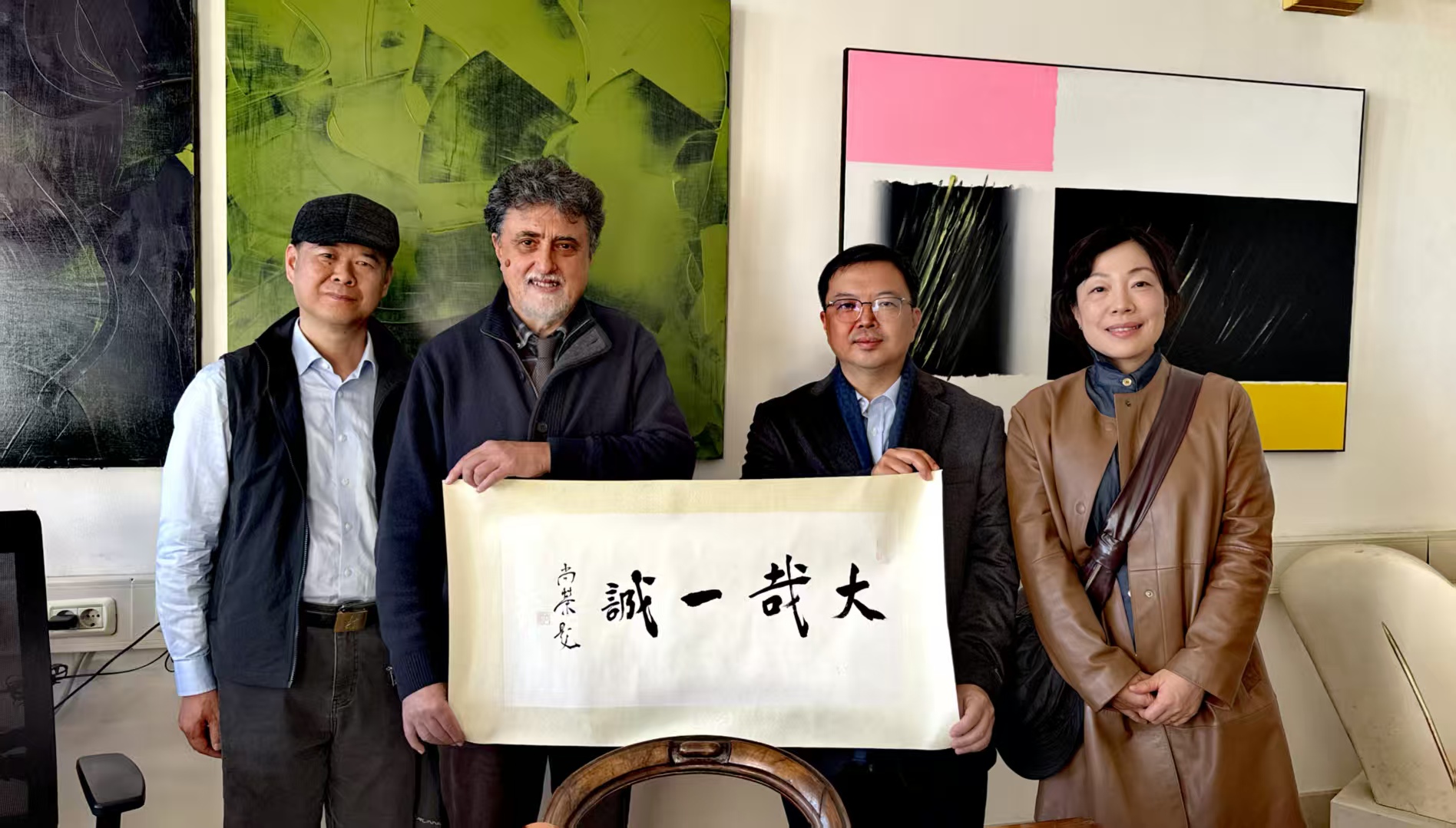 在访问威尼斯美术学院期间,尚荣副院长与威尼斯美术学院院长Riccardo Caldura进行了亲切会谈,双方就“全球青年赛博雕塑共创计划”达成合作意向,并围绕教学理念、艺术创作等方面展开深入交流。尚荣表示,威尼斯美术学院作为欧洲历史悠久的艺术重镇,在绘画、雕塑、装饰艺术等领域的深厚积淀,与南京大学艺术学院在东方美学、写意雕塑方向的探索高度互补,双方具备广阔的合作空间。会谈中,尚荣副院长特别强调:“中国近现代美术教育深受欧洲影响,我们始终心怀敬意。今天,我们期待在更加完善的平台上进一步开展双向对话与共创。”尚荣副院长还赠送了用中国书法书写的南京大学校歌词“大哉一诚”以赠,表示“诚”作为中华文化核心价值,历来为中国人所重,“诚恳、真诚,是最伟大、最有力量的品质”,并表示此行“带着诚意而来,期待达成共同诉求”。