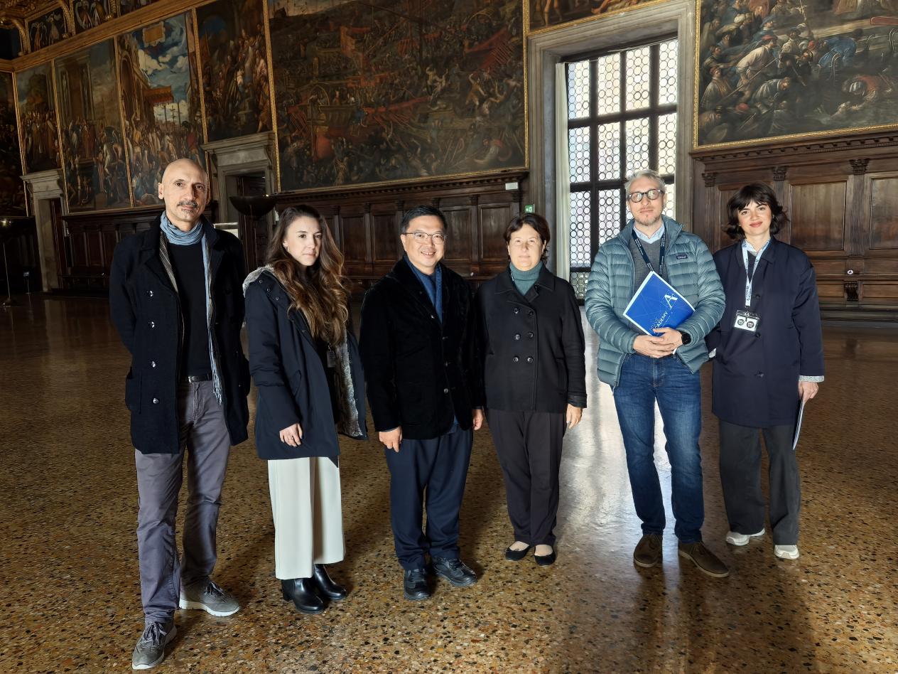 同日,尚荣副院长一行受邀赴威尼斯总督府大会议厅参观交流,与威尼斯市立博物馆馆长Chiara Squarcina、威尼斯博物馆基金会学院负责人Pietroluigi Genovesi,以及基金会学院文化教育与研究平台的负责人进行深入交流。该基金会管理包括总督府、科雷尔博物馆、佩萨罗现代艺术馆等11座重要文化机构。
