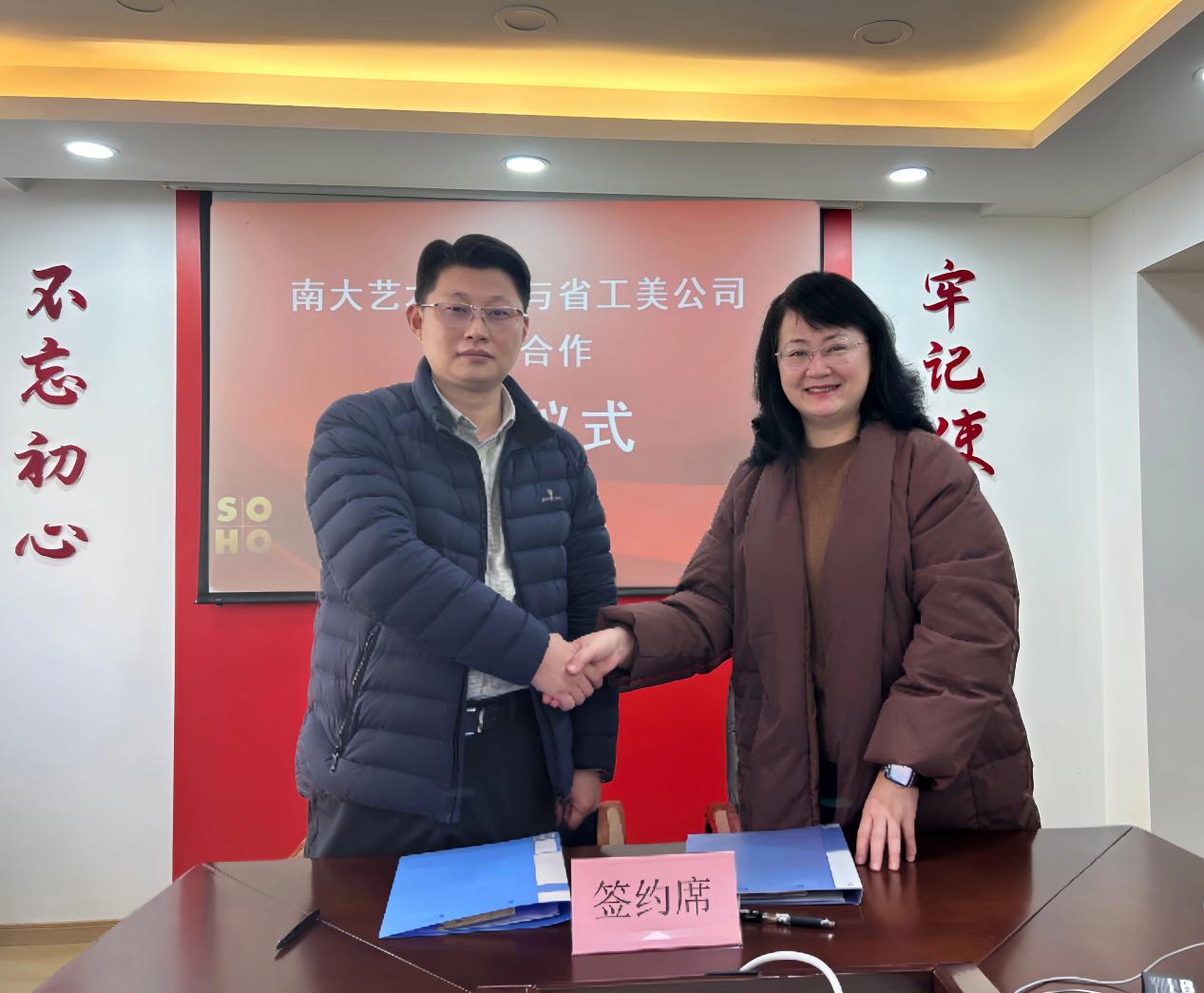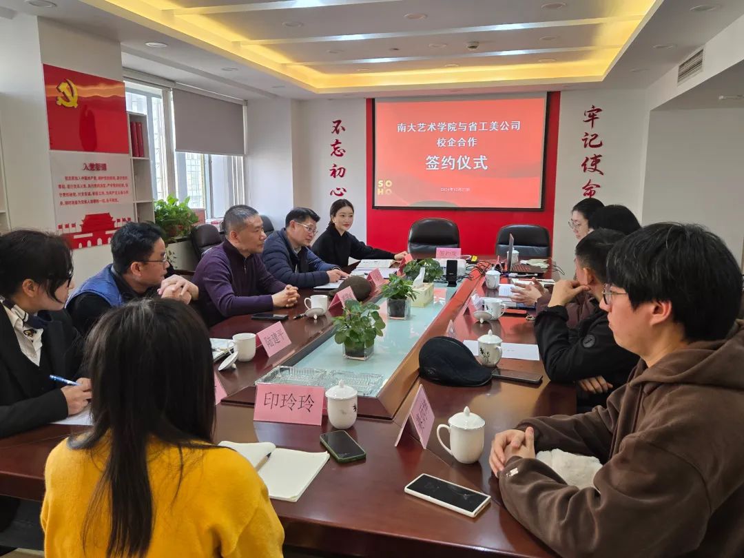 2024年12月27日上午,受江苏省工艺美术有限公司邀请,麻豆TV 党委书记石红梅、党政办主任陈小鸣、学工办主任周素戎等一行前去实地调研,双方就校企合作开展深入交流并签订合作协议。江苏省工艺美术有限公司党支部书记、董事长姜国威,副总经理、党支部委员张金力,党支部委员、中工美(江苏)进出口有限责任公司总经理陆建平等人出席了会议。