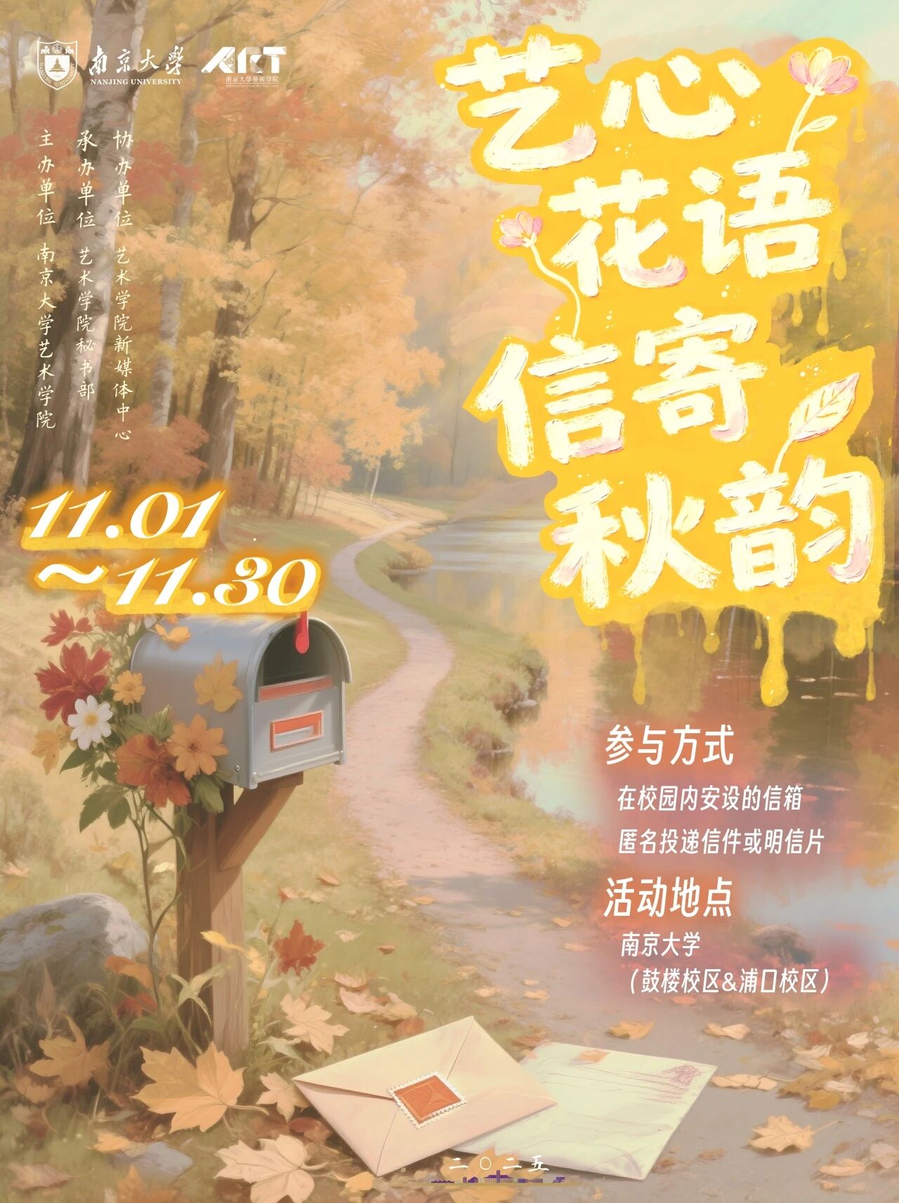 深秋的南京大学浦口校区,层林尽染间藏着一抹别样温柔——由南京大学艺术学院主办的 “艺心花语,信寄秋韵”心理关怀活动,自11月1日启动至12月8日收官,历时一个多月,以“信+花”的创意形式搭建起心灵的桥梁,为学子们送上了一场跨越深秋的治愈之旅,如今已圆满落下帷幕。