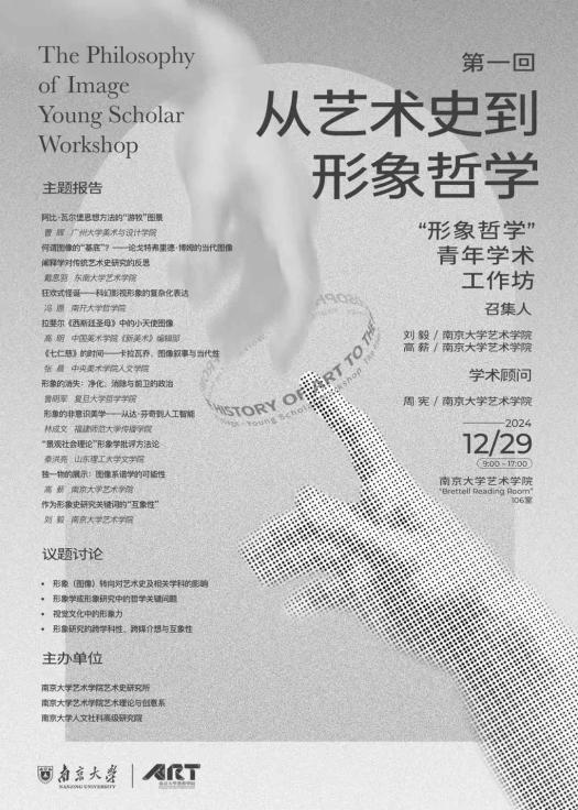 2024年,为了拓展该研究领域与相关话题在青年学者中的延伸,在南京大学人文社会科学高级研究院的支持下,南京大学艺术学院召集来自全国不同高校和学术单位的10位青年学者召开了“形象哲学”青年工作坊。作为一项长期计划,青年工作坊的第一期将论题聚焦于“从艺术史到形象哲学”。艺术史是形象及图像研究的老牌学科,从19世纪以来已经积累了从图像学(Iconography)、形式分析、符号学、语境论、图像人类学、图像行为理论等在内的诸多方法,并且随着上世纪70年代以来“新艺术史”实践的拓展,形象或图像逐渐成为能够链接更广泛社会历史境况的存在物。另一方面,对图像的关注本身也促进了这个学科的开放,从而能够与思想史和文化史等领域相映照。从艺术史到形象/图像哲学的学术转变,在理论上想要突破对艺术性问题的独一关照,从更广泛的哲学视阈考察形象性的存在。何谓形象?形象如何存在?艺术史上形象的变迁如何反应社会和文化的变迁?我们如何讲述形象-历史?形象又是如何影响我们的审美和认知、文化记忆和权力关系的?这一系列问题不仅关乎艺术的本质,也与哲学中关于存在与表征的议题息息相关。“形象哲学青年工作坊”的第一回以“从艺术史到形象哲学”为专题,除了探索形象与世界,形象与媒介,以及形象与想象和记忆之间的关系外,还试图揭示艺术史为形象哲学所提供的思想资源,以及形象哲学反向对艺术史学术视野的拓展。