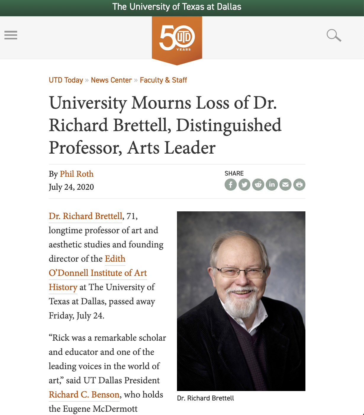 南京大学美国艺术史研究所美方主任理查德·布雷特尔(Richard Brettell)教授于7月24日美国时间下午5点半因病逝世,享年71岁。理查德·布雷特教授是美国德州大学达拉斯分校艺术与美学Margaret M. McDermott特聘讲席教授,以及奥多纳艺术史研究所创始所长和讲席教授。2019年当选为美国艺术与科学院院士。