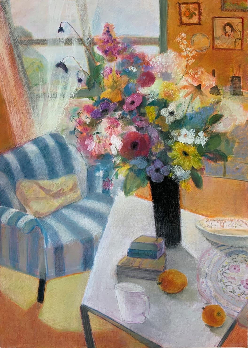 这幅作品采用了饱和度较高的色彩和形变的构图方式,整幅画面以橙黄色调为主,点缀了小部分蓝色,发挥色粉材料的特性,让画面呈现出一种轻松和谐的氛围感。