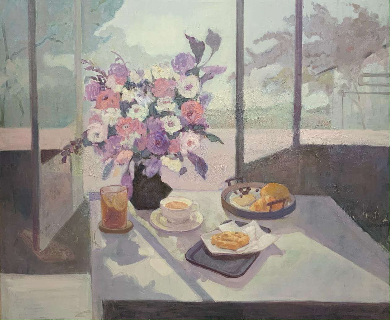 创作《心事》这幅作品时,借鉴了早期静物画的构图形式,并与室内外空间结合进一步加强这种和谐的审美体验,带有一点俯视的视角,而瓶花以侧面示人,物体的处理手法上比较扁平化,尤其是背景和门窗,不做过多刻画,纵向的门框分割画面,形成一定的节奏感,横向被粉色色块分割,画面构成感增强,色彩上则借鉴了印象派的光色处理方法,并在画面中引进了光线的元素,并运用了粉紫色调和绿色色调,色彩纯度较高,亮暗面的冷暖色彩形成对比,但并未采用多笔触的描绘手法,仍然进行几何化处理。使得作品装饰性增强。