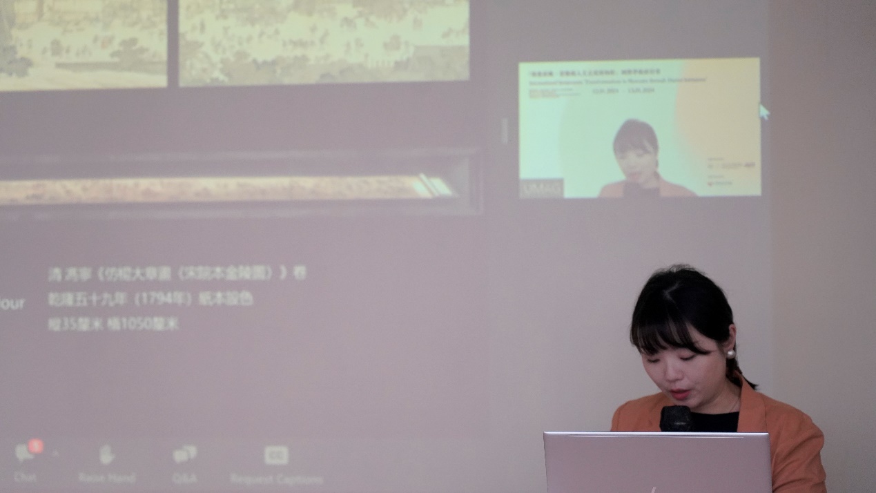 最后,来自香港岭南大学的博士研究生朱轶带来了题为《数字技术与中国传统绘画:通过“金陵图数字艺术展”探索观众的临场感体验》的主旨演讲,提出了以“临场感”为核心的理论框架,指出数字技术不仅为观众提供了互动和引人入胜的参与方式,同时能够转化传统美学中“气韵生动”的审美概念,为观众带来全新的临场感体验,并进一步以“金陵图数字艺术展”为例阐释了数字技术运用与受众体验参与度之间的关系。