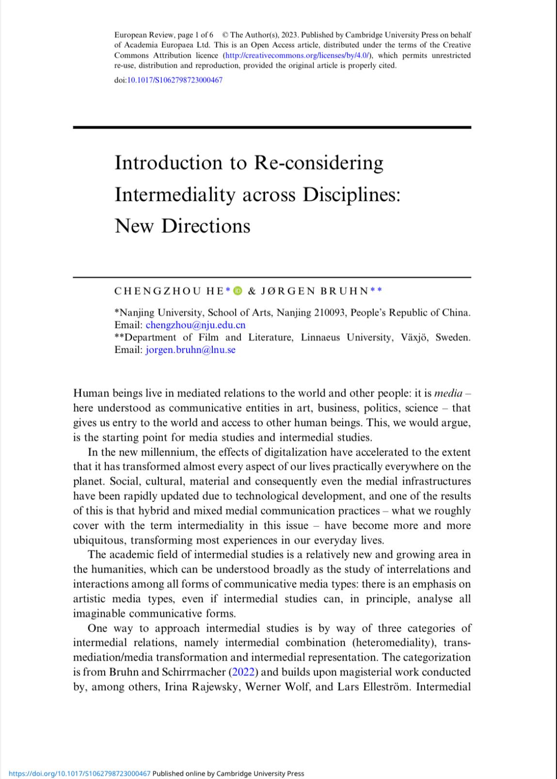 EUROPEAN REVIEW(《欧洲评论》,SSCI收录期刊)是欧洲科学院院刊,2023年10月推出跨媒介研究专辑,由我校何成洲教授和瑞典学者Jorgen Bruhn教授主编,发表10篇论文,作者来自中国、英国、丹麦、瑞典等国家。