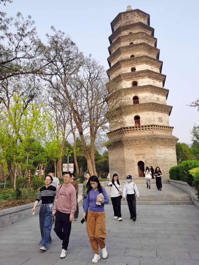 随后,师生一行前往花果山郁林观,实地考察“唐隶宋篆”刻石——唐代《东海县郁林观东岩壁纪》和宋代《苏唐卿篆书<祖无择三言诗>》,以及云台山海清寺宋代阿育王塔。其中,《郁林观东岩壁纪》铭纪于唐开元七年(719),结字、笔法熔铸篆隶法度,古意盎然,展现初唐隶书风规。