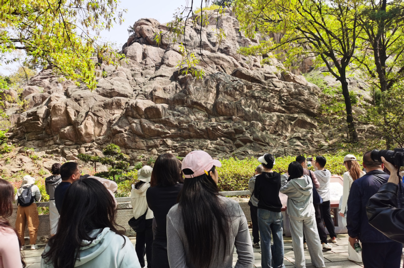 4月10日上午,师生一行先后考察孔望山龙洞碑林、东汉摩崖造像、锦屏山将军崖史前岩画。孔望山龙洞碑林现存宋、金、元、明、清诸代题刻二十四方,篆、隶、真、行各体兼备。如龙洞诸题刻。
