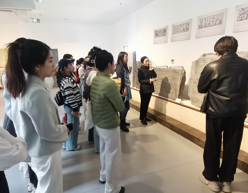 师生一行首先参观徐州汉画像石艺术馆专题陈展,南北两馆共展出600余块汉代画像墓石,涵盖神话传说、历史故事、现实生活等多方面内容,让师生们大饱眼福。较之临沂吴白庄东汉晚期墓石画像,雕刻技法上,徐州墓石画像大抵以剔地浅浮雕和凹面线刻为主,并能根据图像实际需要而变换表现手法。吴白庄墓石画像以凹面线刻和高浮雕、透雕为主,与西方雕刻艺术的风格特征有相似之处。