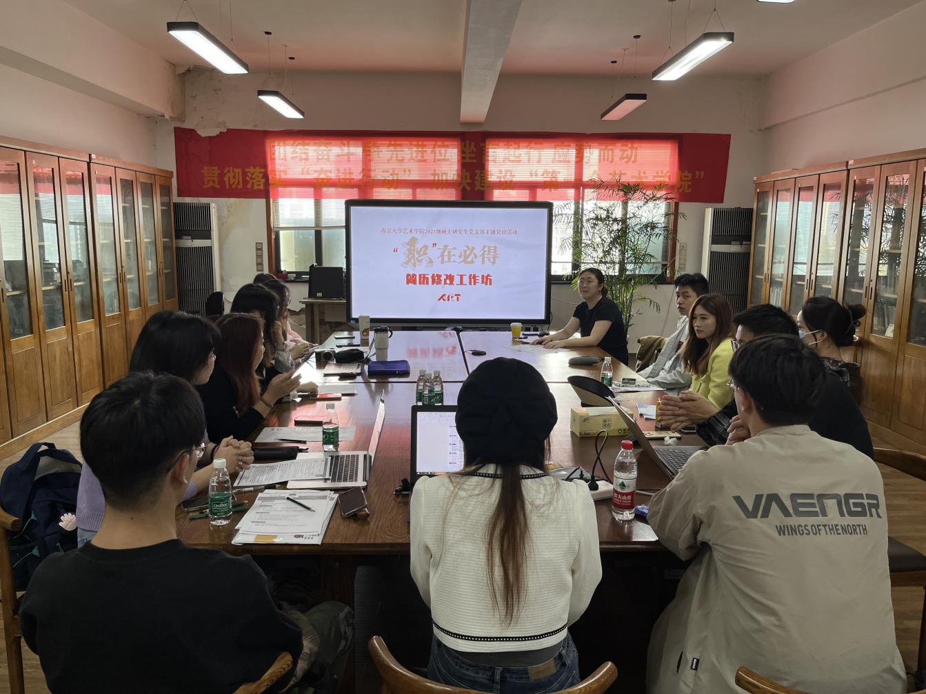 10月24日下午,艺术学院2021级硕士研究生党、团支部在艺术学院阅览室举行了“‘职’在必得”简历修改工作坊。本次工作坊以贯彻落实“奋进行动”、推进高质量就业为指导,结合党、团支部切实需要,面向毕业年级全体党团员开展,由院团委副书记、研究生辅导员周素戎老师主讲。