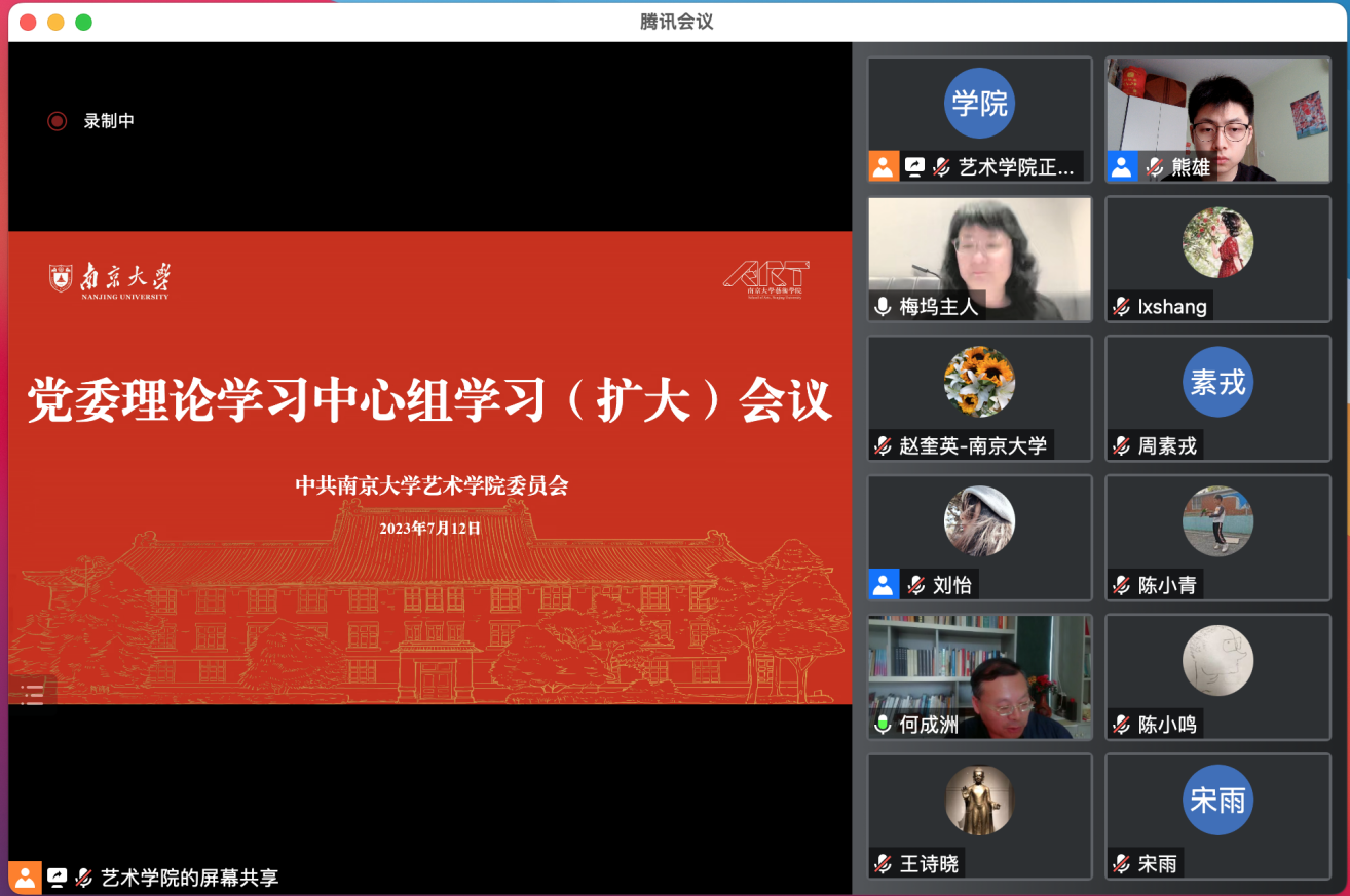 为深入开展学习贯彻习近平新时代中国特色社会主义思想主题教育,落实南京大学主题教育暑期工作方案,艺术学院于7月12日召开党委理论学习中心组学习(扩大)会议。艺术学院党委书记石红梅主持会议并作领学发言,党委副书记、院长何成洲和党委委员周素戎分别做主题领学。艺术学院党政班子成员、党委委员、党政联席会成员、德育导师、辅导员和各支部书记参加学习。