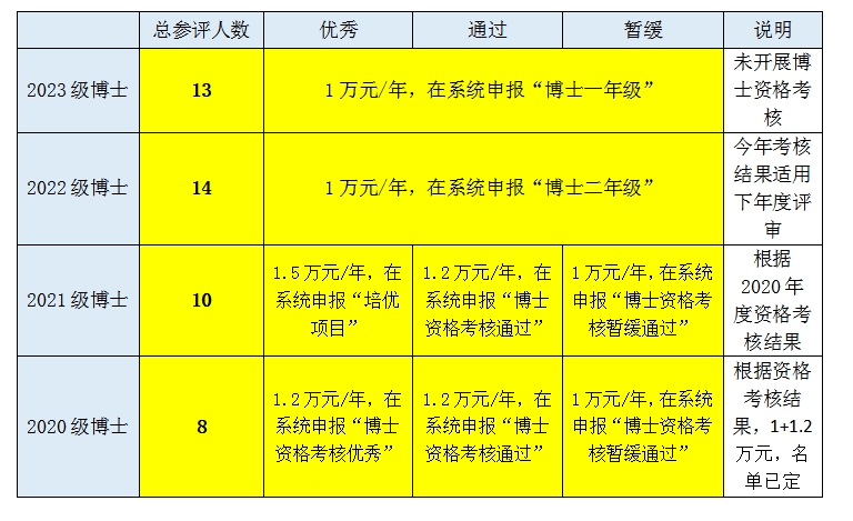 1.2023级/2022级博士:不再设定等级和比例,在资格考核通过前每人1万元,2022级博士虽已考核结束,但结果用于下一年度。
